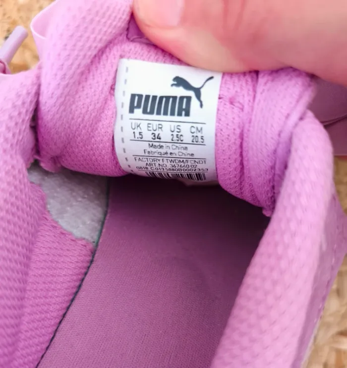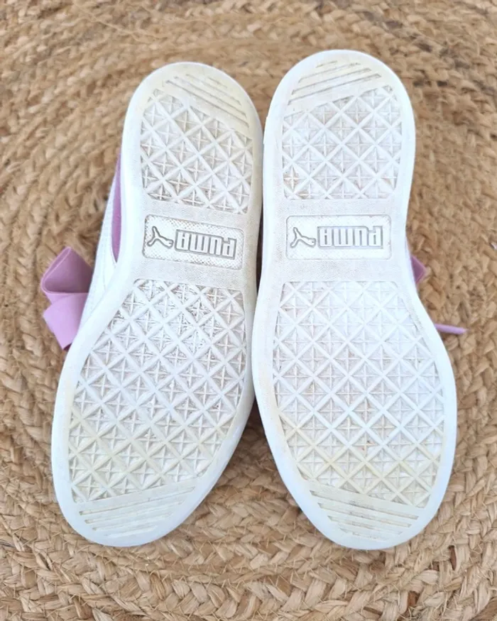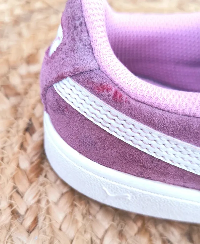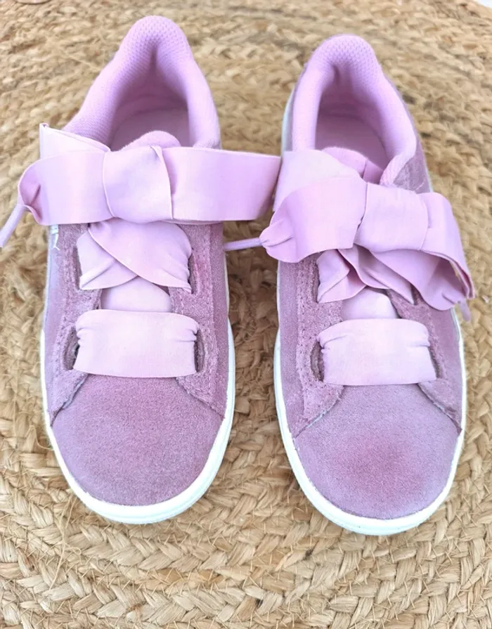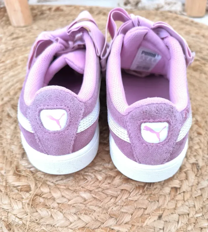 #loulaliechaus34 dans la recherche pour voir mon 34 fille Baskets Puma T.34 daim Lila, lacets élastiques avec gros noeud.