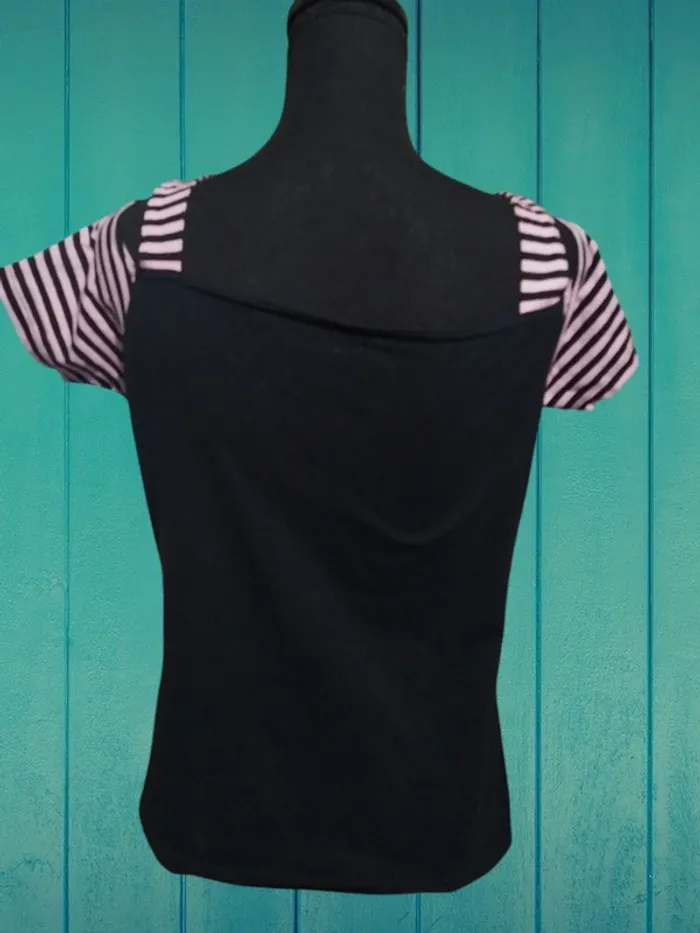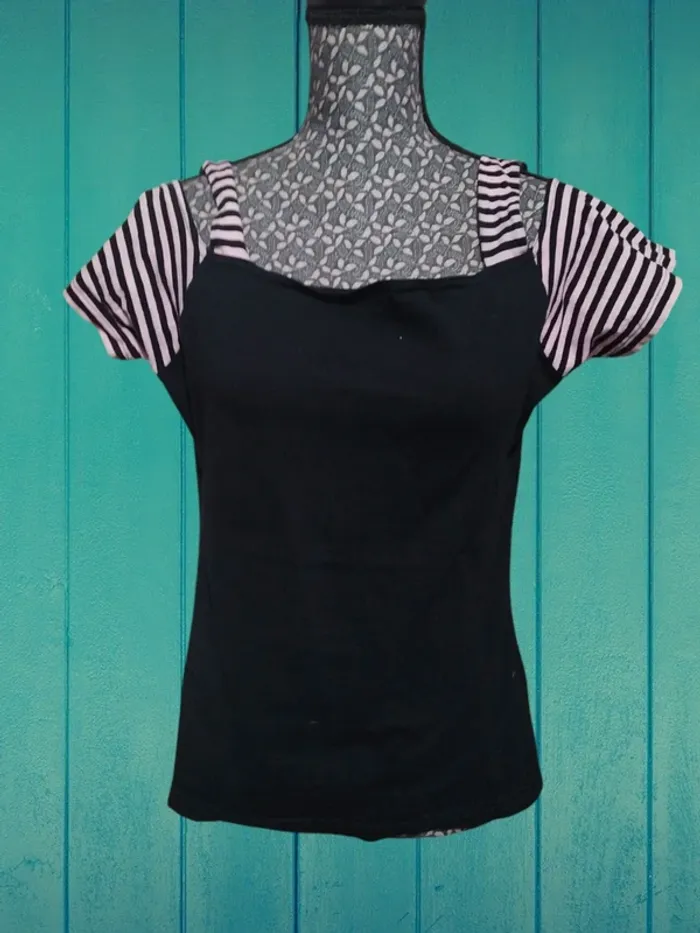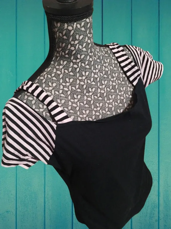 Vend un t-shirt manches courtes épaules nu. Étiquette de taille manquante Dimensions épaules à épaules 30 cm Aisselles à aisselles 44 cm Longueur totale 60 cm Noir et rose #lylla19femme