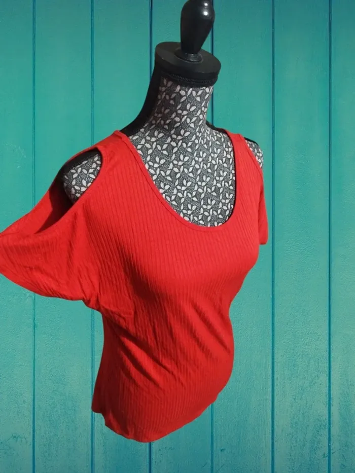 Vend un t-shirt épaules nu. Marque cache cache. Étiquette de taille manquante Dimensions épaules à épaules 33 cm Aisselles à aisselles 55 cm Longueur totale 62 cm Rouge #lylla19femme