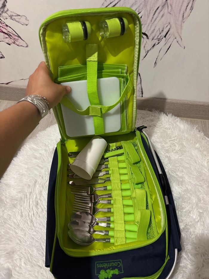 #vincentmelanieaccessoiresmaison #sacpicnic #sacisotherme Sac a pic nic isotherme rétractable fournis avec tous les couverts des serviettes réutilisable salière poivrière et gobelets planche à découper… Une fermeture déraille voir photo
