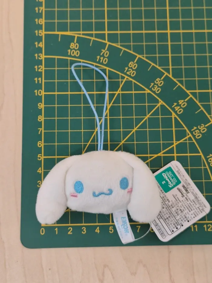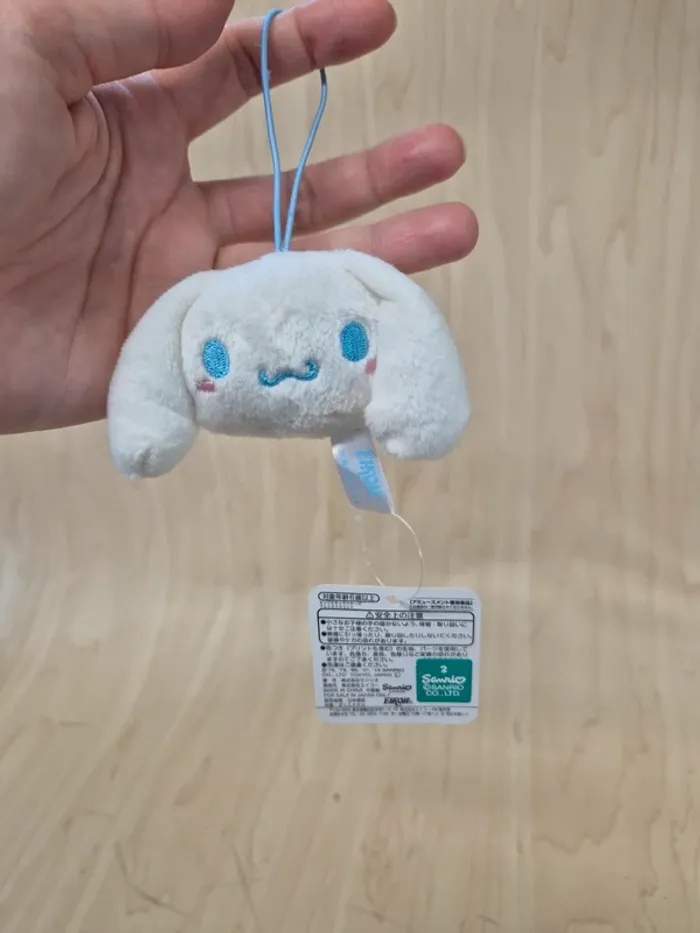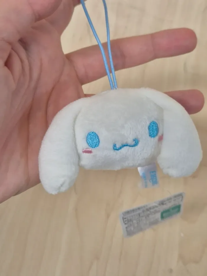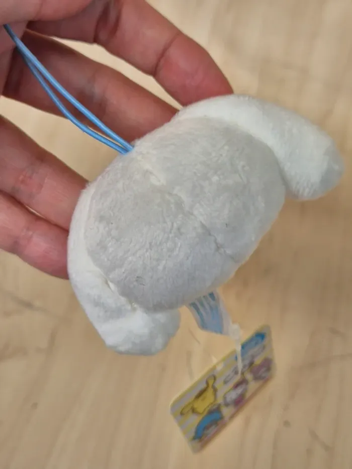 Mini mascotte peluche Sanrio : Cinnamoroll. Peluche polyester, environ 5 x 6 cm. En excellent état avec élastique d'accroche. #chsanrio