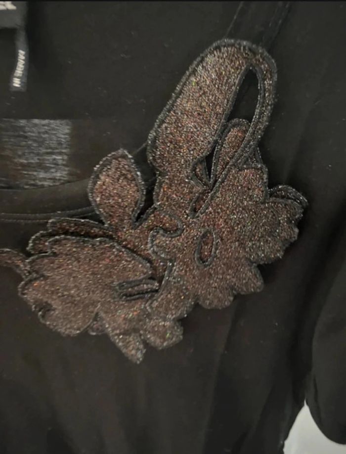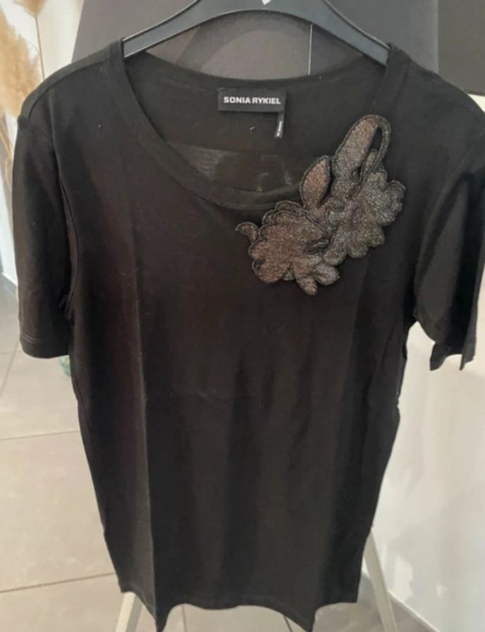 Haut Sonia Rykiel manches courtes noire en soie et coton col rond déco rapportée devant noire brillante taille XS mais taille grand je dirais plutôt S voir M #marie27031965femmeXS #marie27031965femmes