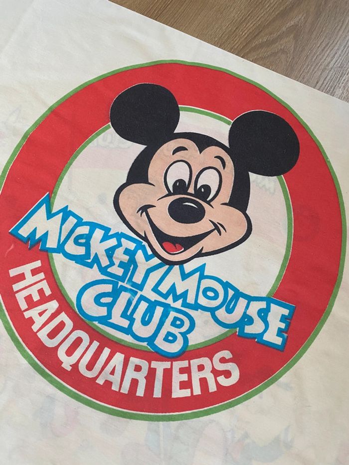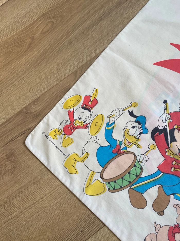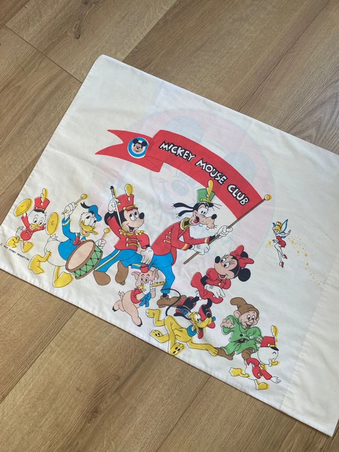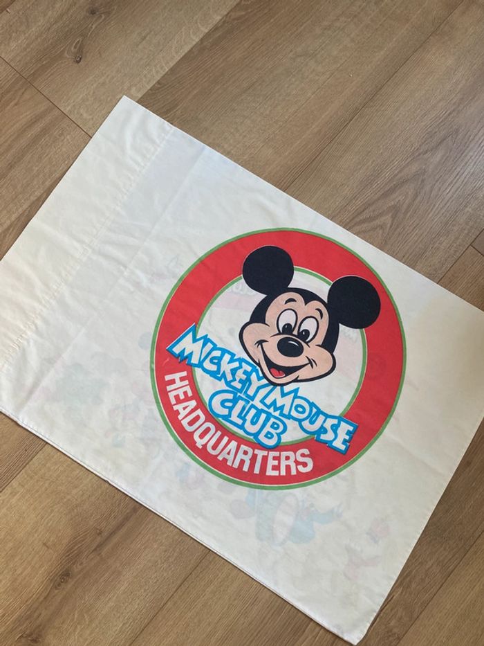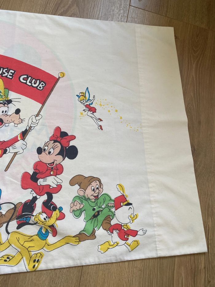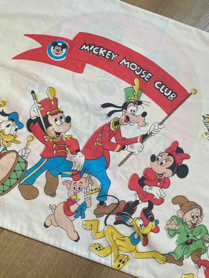 Taie d’oreiller Mickey Disney rectangle 75x52 cm Vintage d’il y a 30 ans Bon état général, le tissus est un peu jaunie par endroit Thème Mickey Disney En 100 % coton