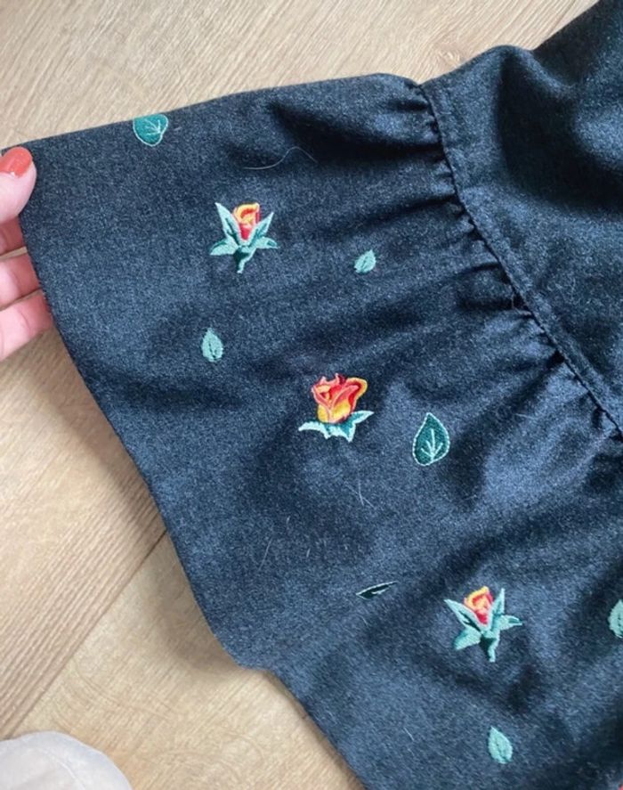 Jupe patineuse grise et broderie fleurs Vintage d’il y a 30 ans Étiquette 16 ans mais correspond à une taille 42. 44 cm de largeur mais bon pour un 42 car n’est pas élastiqué. Longueur 53 cm Parfait état 60 % laine 40 % polyester