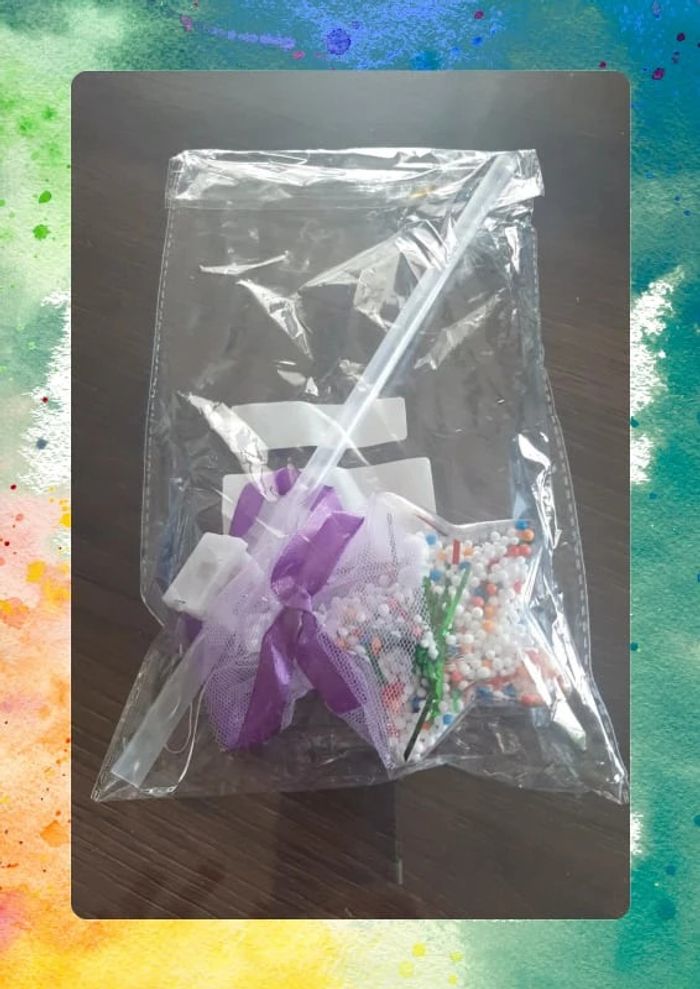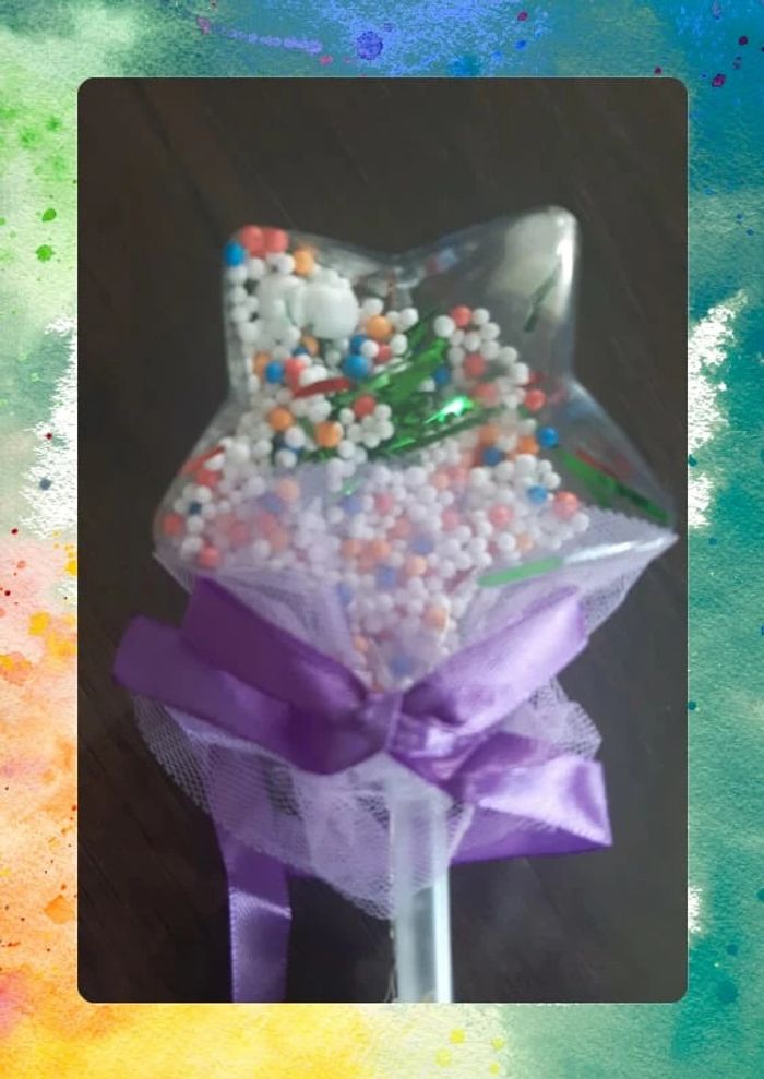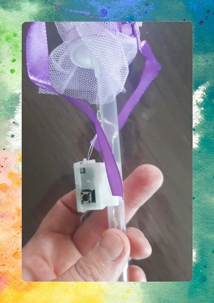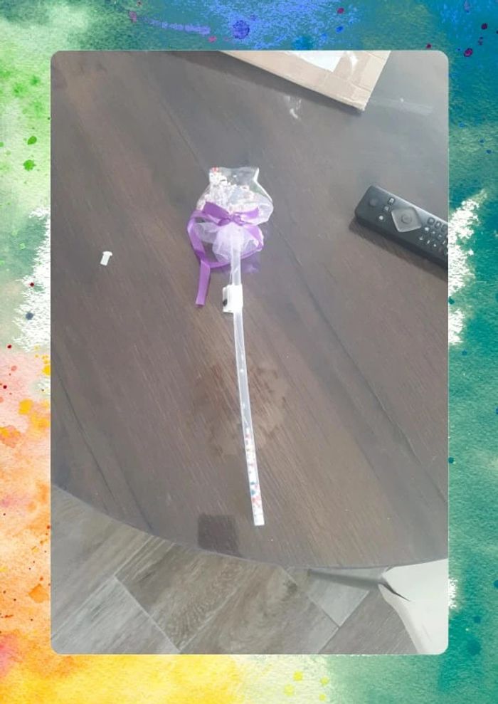 Jolie baguette lumineuse transparente avec embout décoré et ruban violet. Remplie de petites perles colorées, elle scintille à l’allumage. Plusieurs modes de lumière disponibles pour varier les effets. Idéale pour un déguisement, un anniversaire ou pour jouer à la fée ✨ neuve