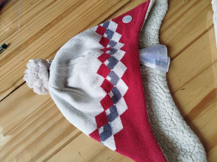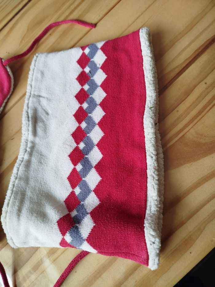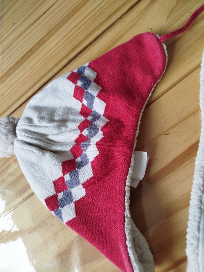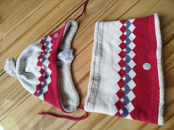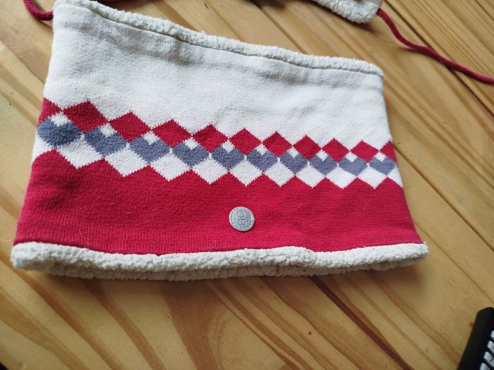 Ensemble bonnet et cache cou couleur blanc et rouge marque obaibi taille 48 pour le bonnet taille unique pour le tour de cou