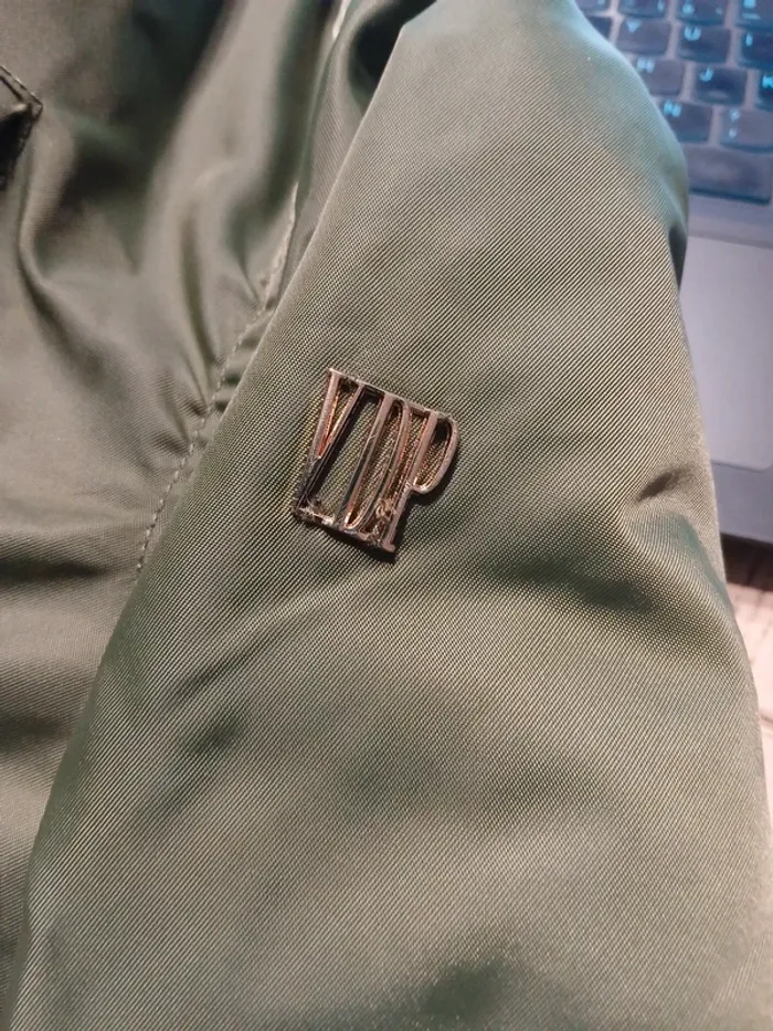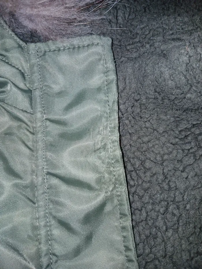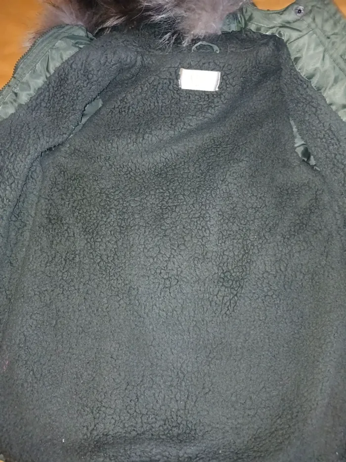 Avec capuche. Fourrure de la capuche amovible. Zippé et pressions. Intérieur en fourrure. Poches. Petite marque sur le revers des pressions (voir photo).