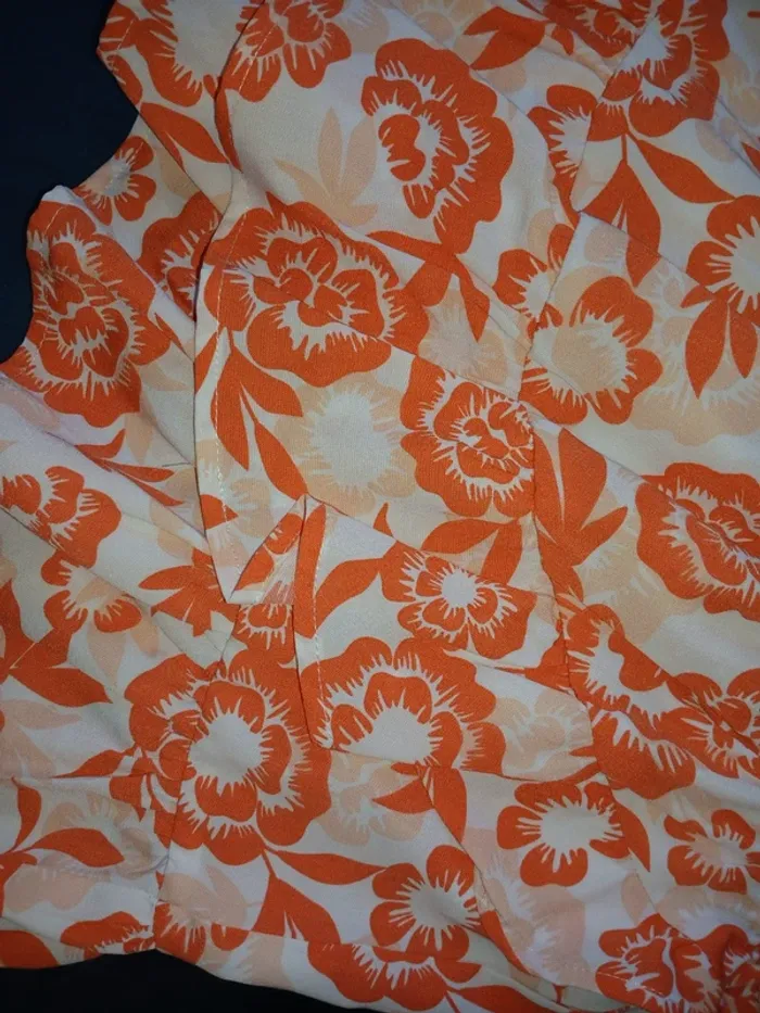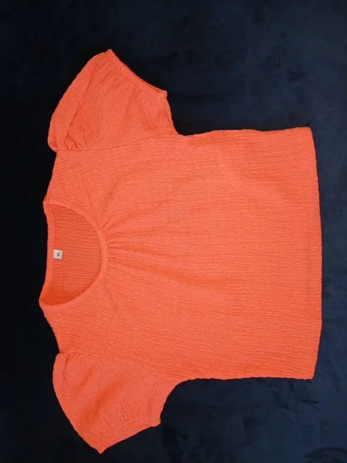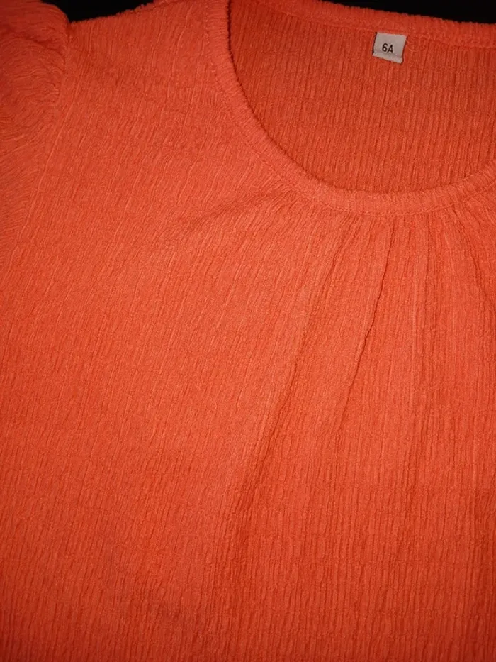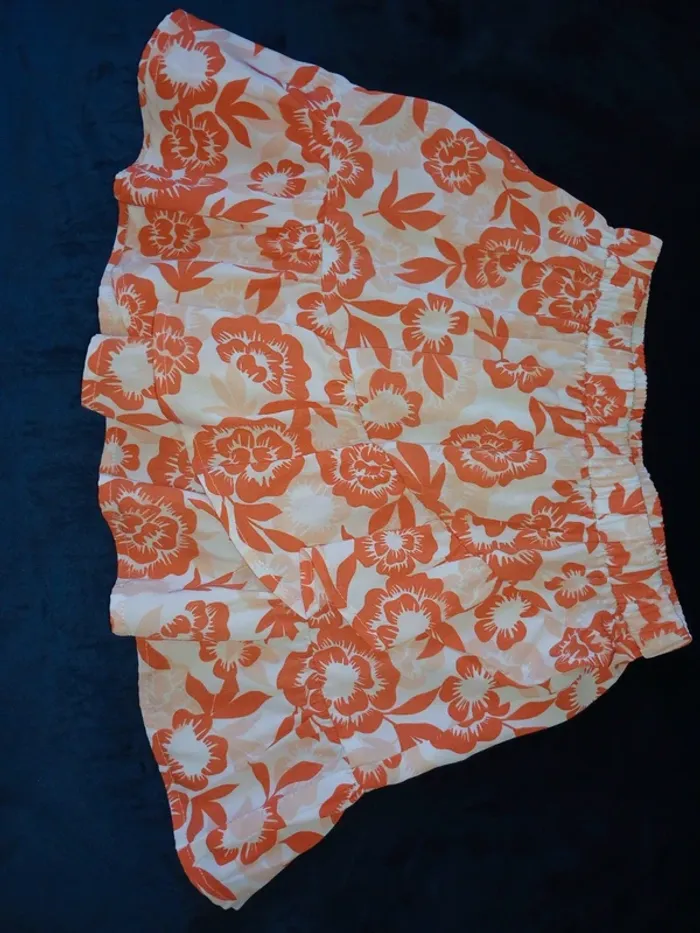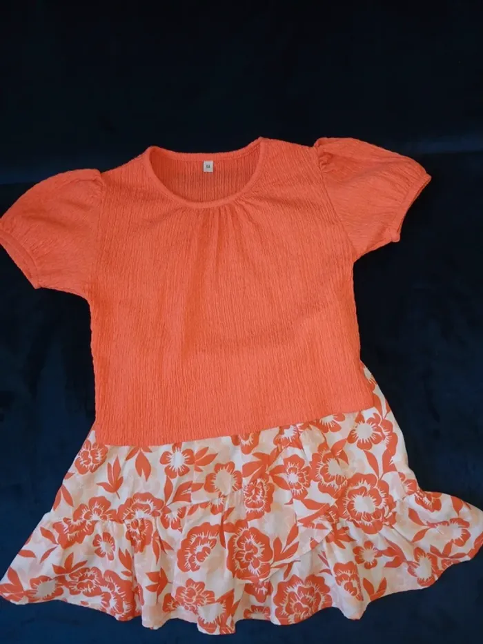Jupe taille élastiquée. Avec volants. Haut uni orange manches courtes.