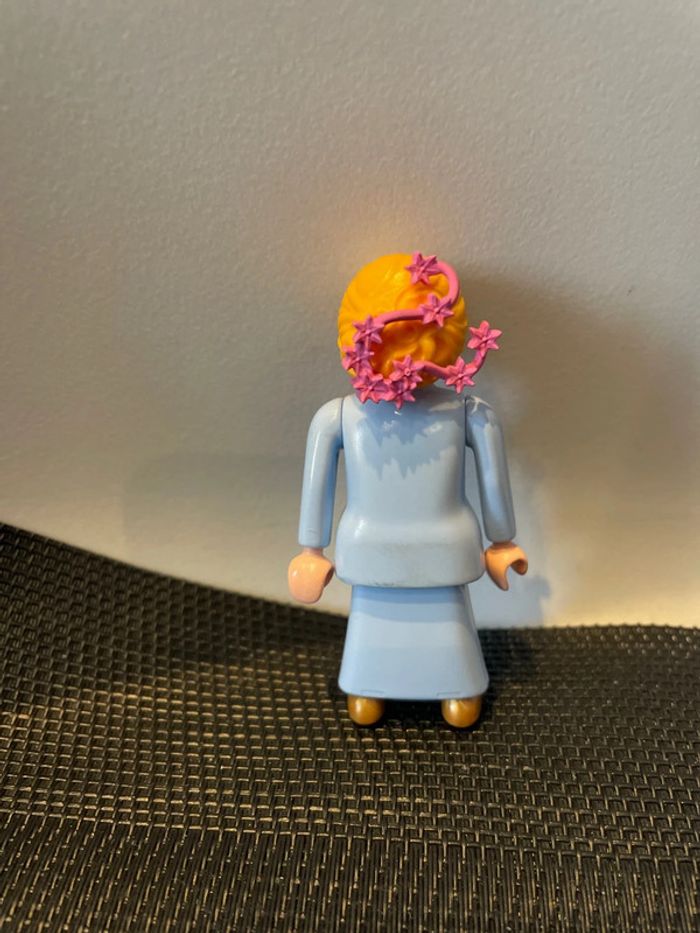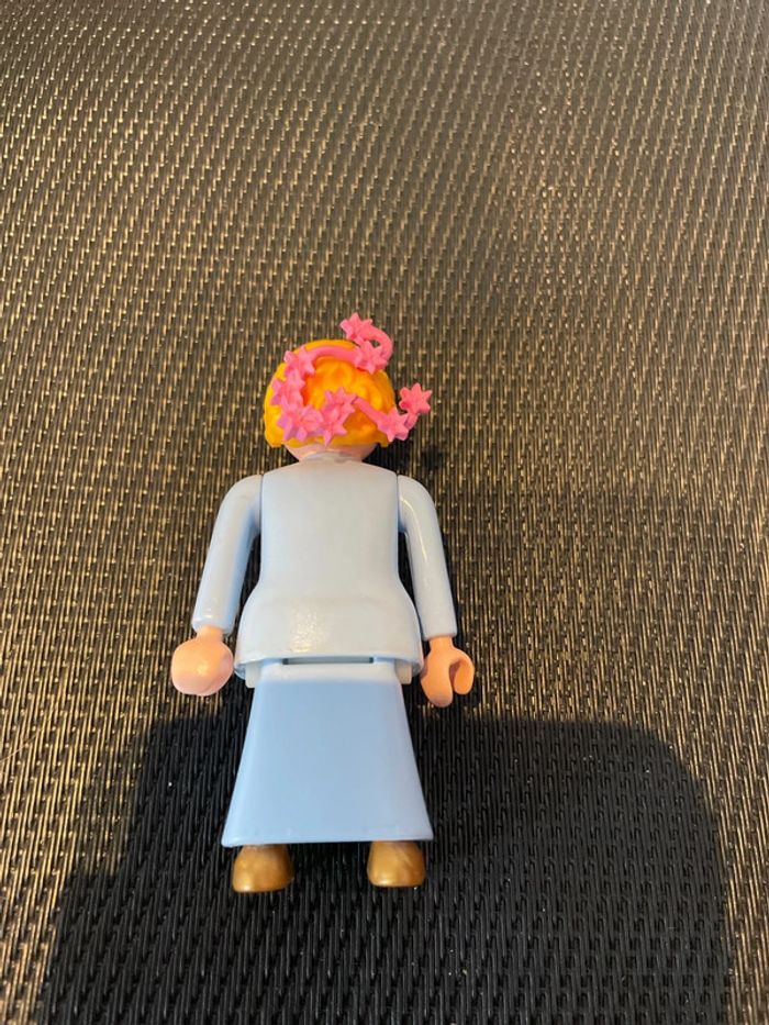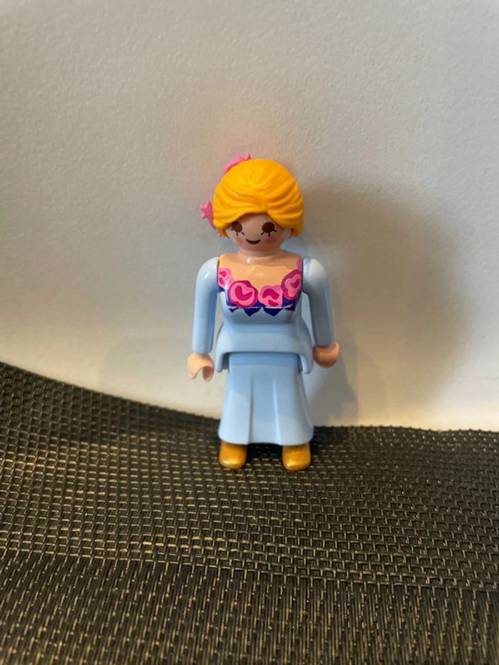 Playmobil figurine femme blonde robe bleue il en fleurs et accessoire cheveux