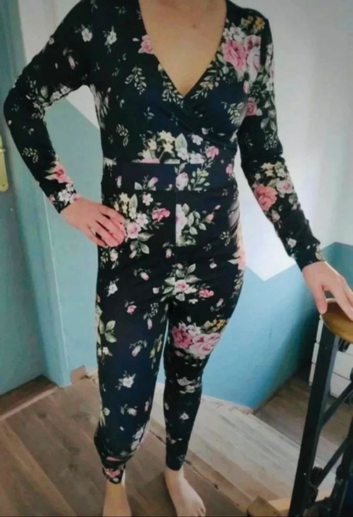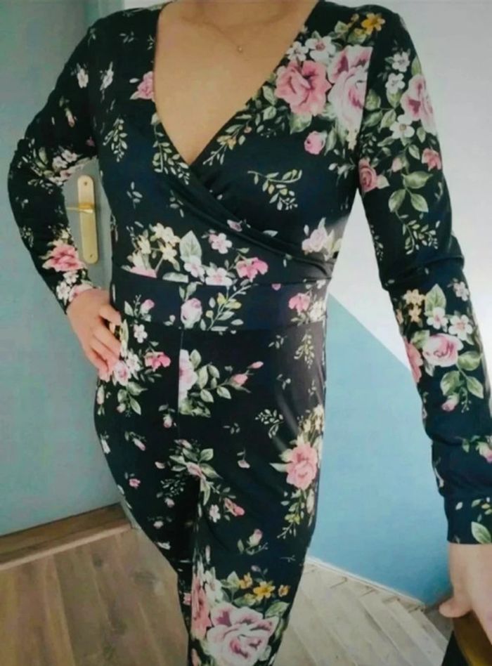 Noire aux motifs fleuris 💐 Matière polyester Neuve avec étiquette #combinaison #combinaisonnoire #floral #flower #combinaisonnoirefleurie #taille38 #floraljumpsuit #monofloral #taillem #sexycombi