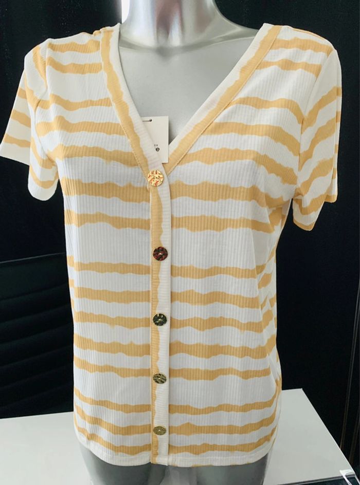 Tres joli haut col V devant et derriere Coloris blanc et moutarde Finition par faux boutons dorés sur le devant Taille L Matiere 95% polyester 5% elasthanne Neuf avec étiquette #teeshirtblancetmoutarde #teeshirtcolv #teeshirtbicolor #teeshirttaillel #pimkiel #whiteandmustardtshirt #camisetablancaymostaza