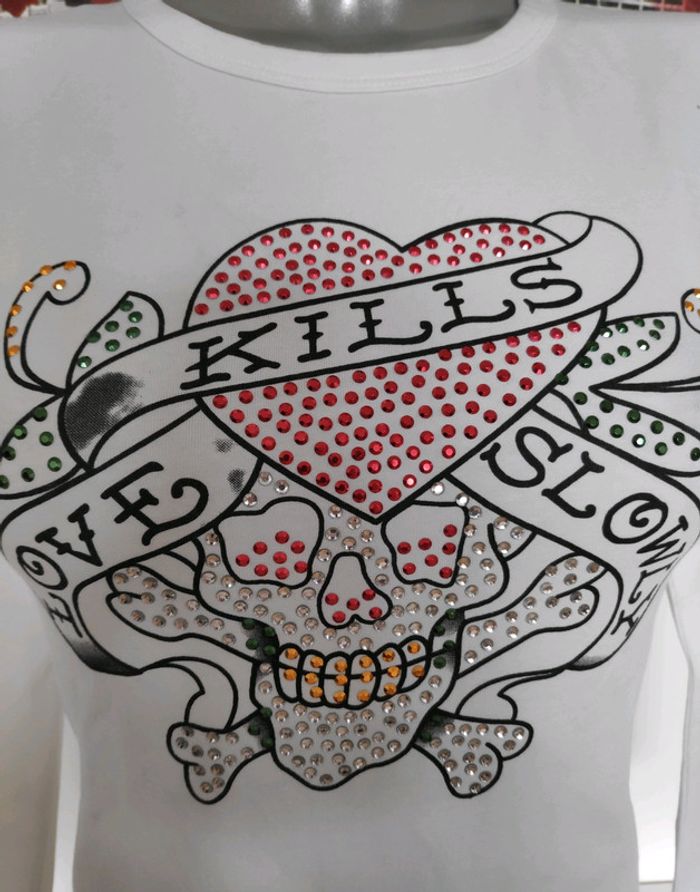 Tee shirt au motif there de mort Taille S Pouvant convenir a une taille M Tres bon etat #teeshirtmancheslongurs #tailles #tetedemort #strass #teeshirtfemme #skulltshirt #camisetaconcalavera