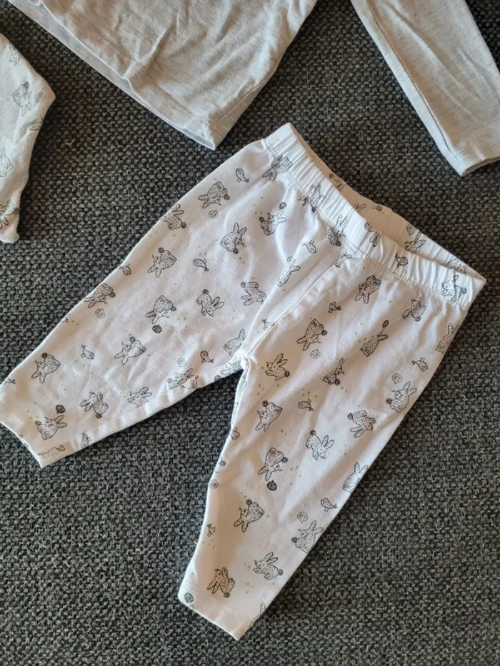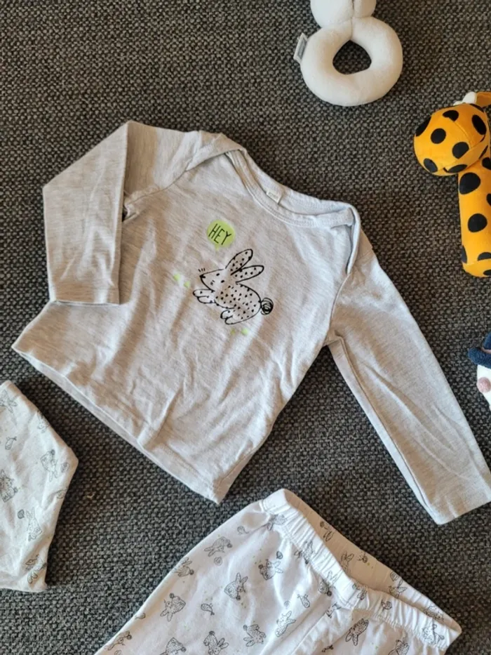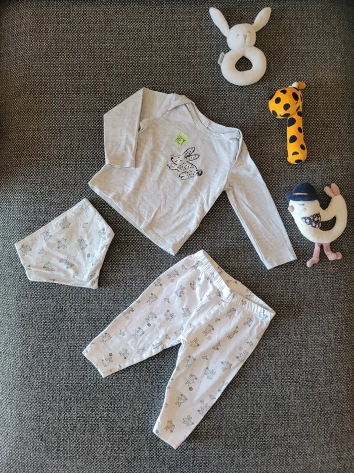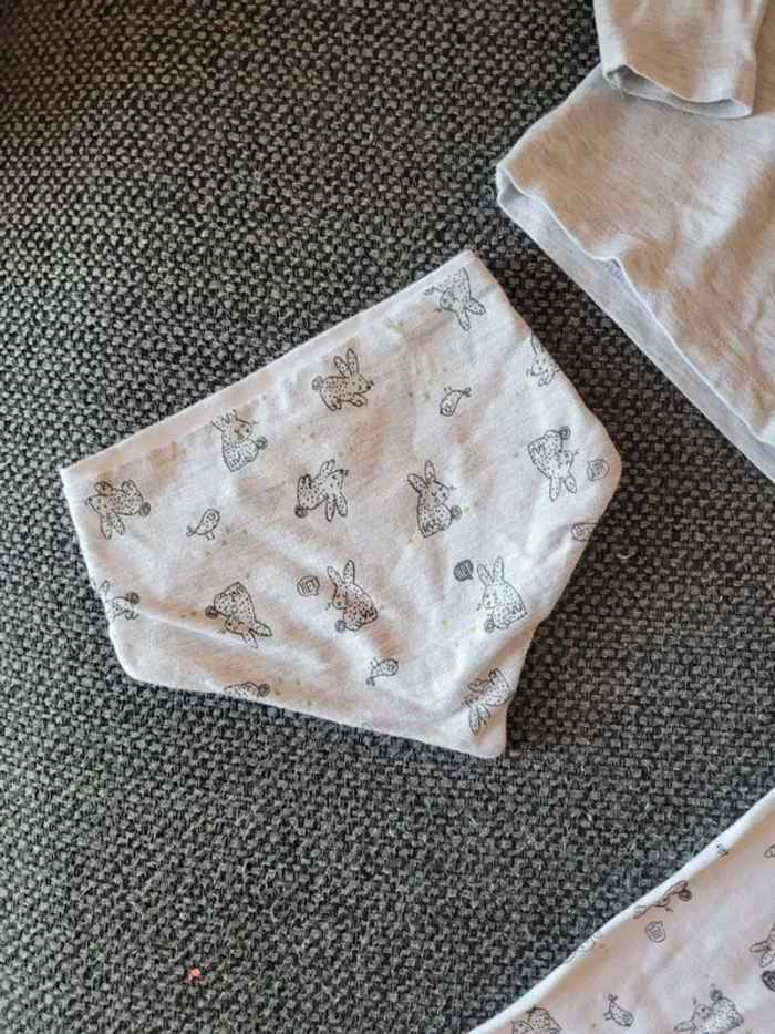 Ensemble pour garçon de taille 62-68 cm (équivalent 3-6 mois) Composé d'un t-shirt à manches longues, d'un pantalon et dun bavoir bandana assortis En tissu donc idéal mi-saison Thème lapins Aucune tâche ni trou #mabi38780garcon3mois #mabi38780garcon6mois
