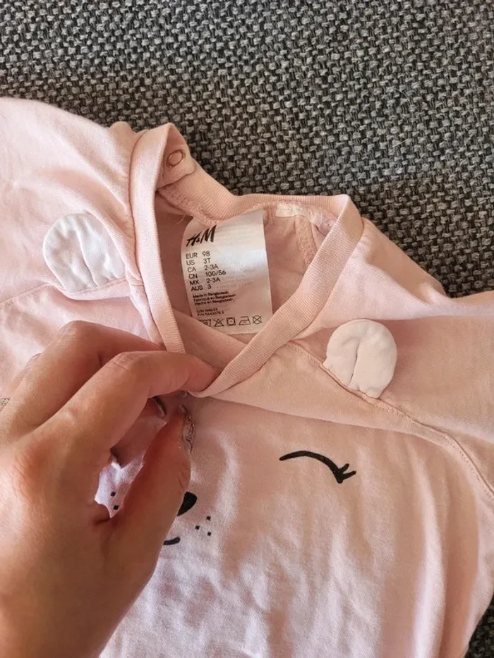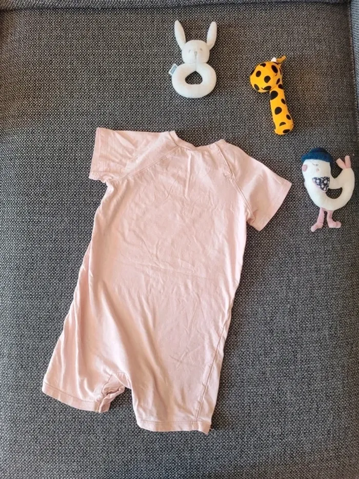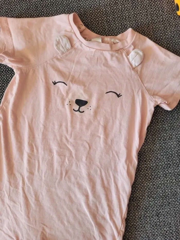 Pyjama pour fille de la marque H&M et de taille 98 cm (équivalent 3 ans) Type combinaison en coton Manches courtes et bas short Couleur rose clair à motif tête d'ourson avec oreilles en relief Attache par pressions derrière Aucun tâche ni trou #mabi38780fille3ans