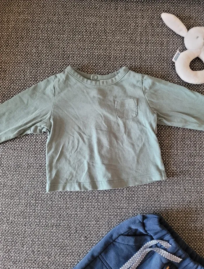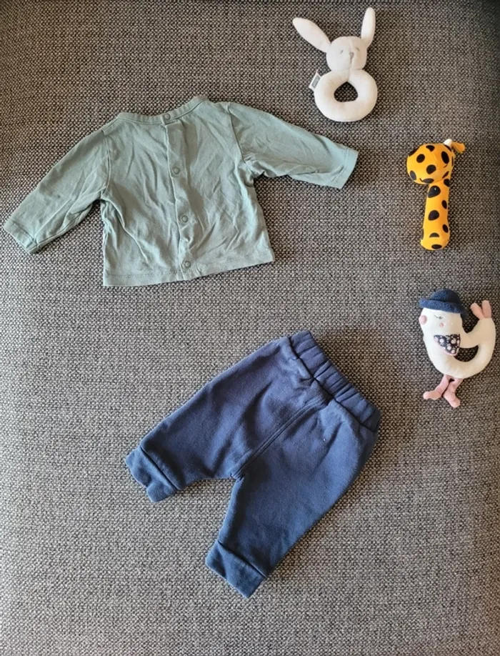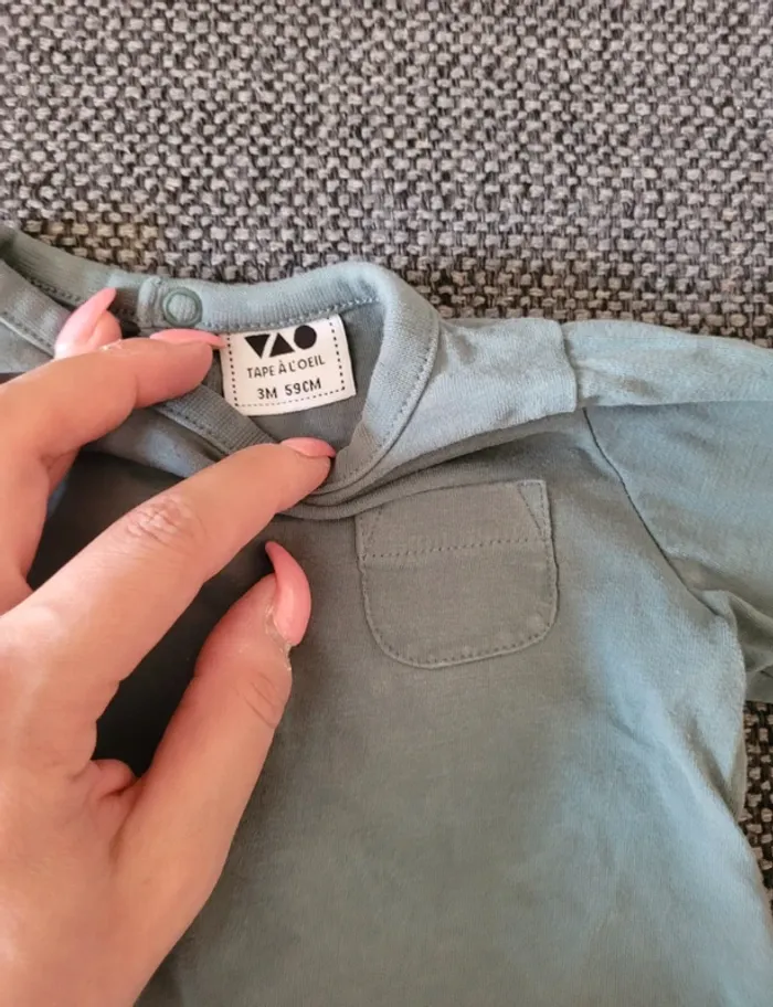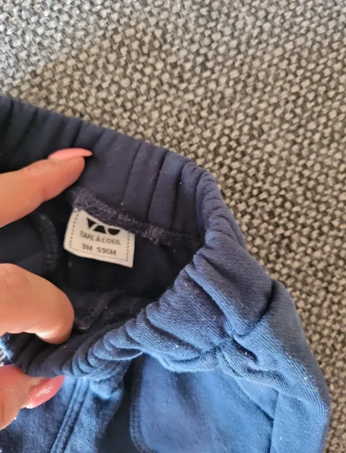Ensemble pour garçon de taille 3 mois et de la marque Tape à l'œil (TAO) Avec un t-shirt à manches longues s'attachant par pressions dans le dos et un bas molletonné type sarouel/jogging assorti Aucune tâche ni trou. Juste quelques bouloches sur le pantalon et la couleur qui part sur quelques pressions du t-shirt (voir photos). #mabi38780garcon3mois