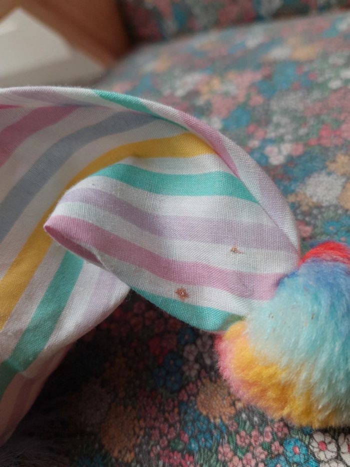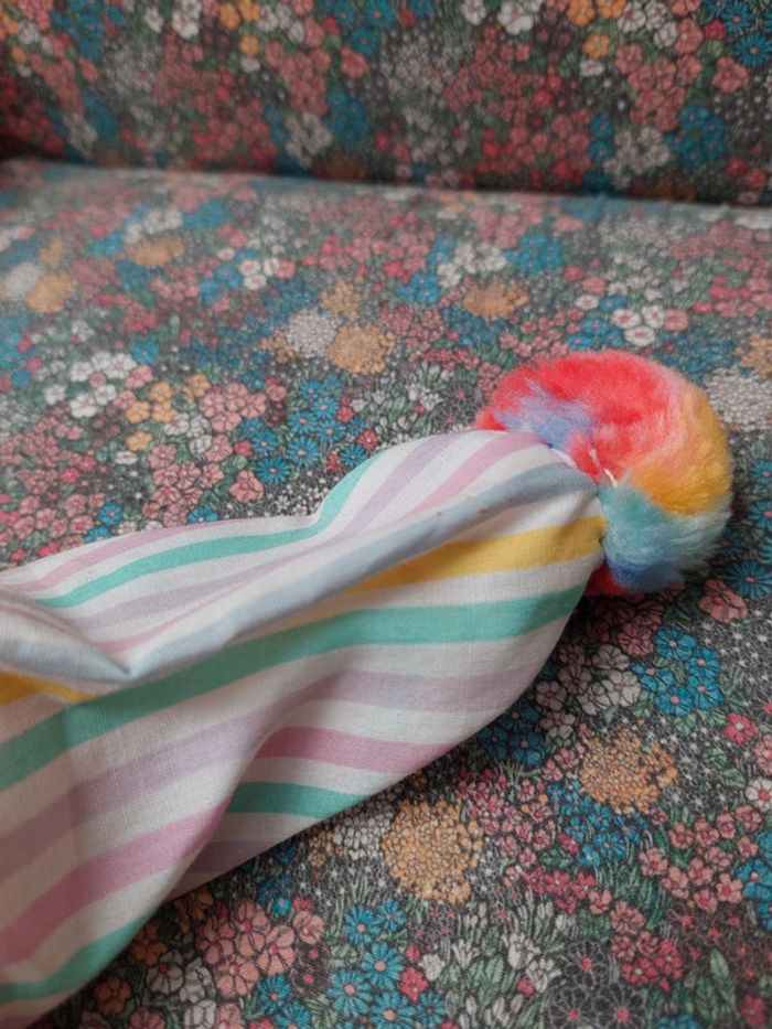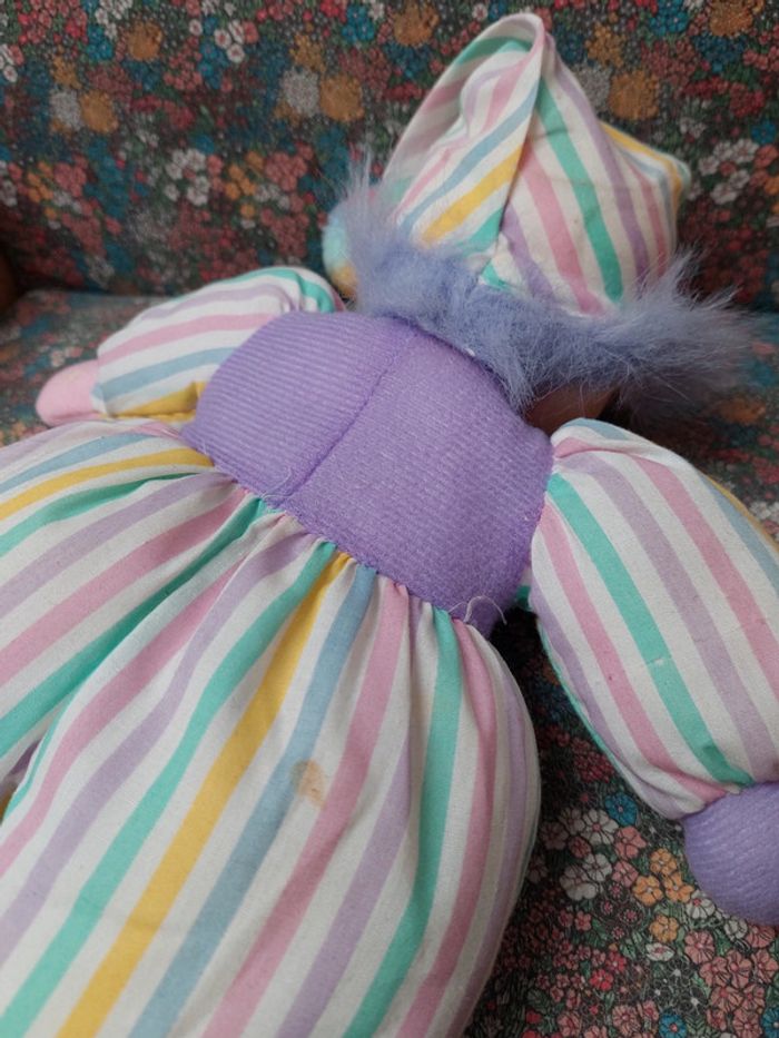 Adorable poupée poupon de chiffon vintage Costume et bonnet pompon rayé multicolore Chaussons roses et violet Cheveux mauves et cœur bleu sur la joue La fonctionalité des lots étant disponible, n'hésitez pas à consulter le #lameredechine pour pouvoir facilement vous promener dans ma boutique.