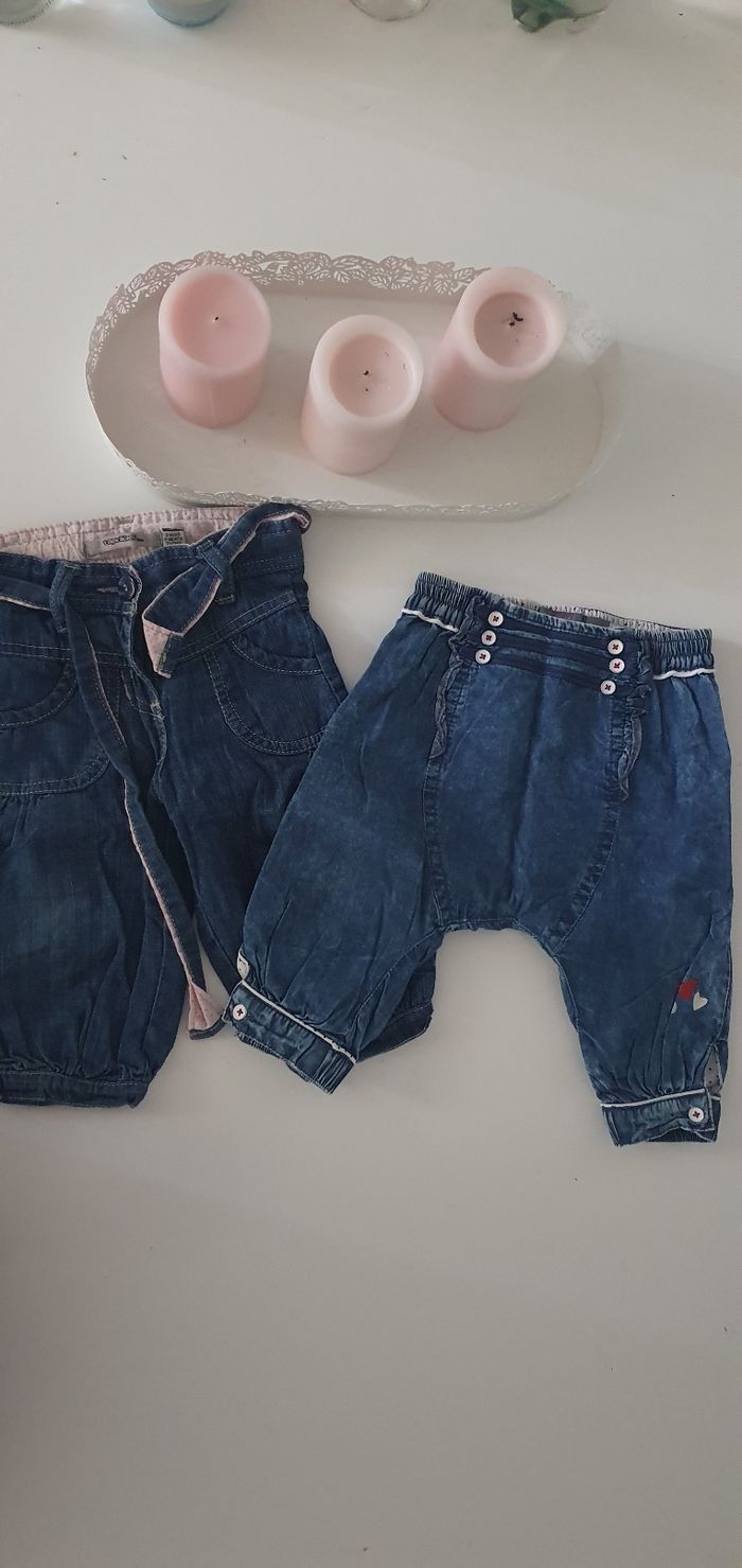 Deux jolis pantalons Le 1er marque tape à l'œil avec sa ceinture rose pâle et bleu jean et le 2 ieme de la marque orchestra style baggy couleur jean Taille 9 mois