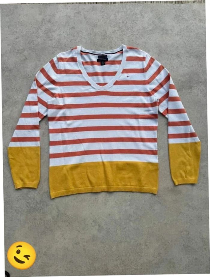 Pull Tommy Hilfiger Col V Taille L blanc orange Femme Women PULL203 - photo numéro 1