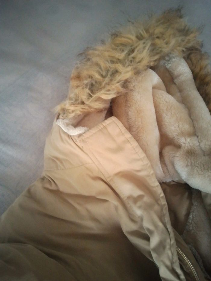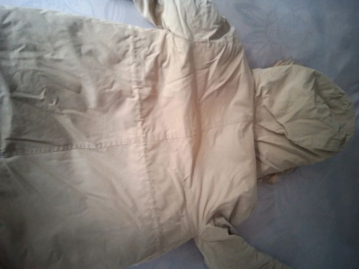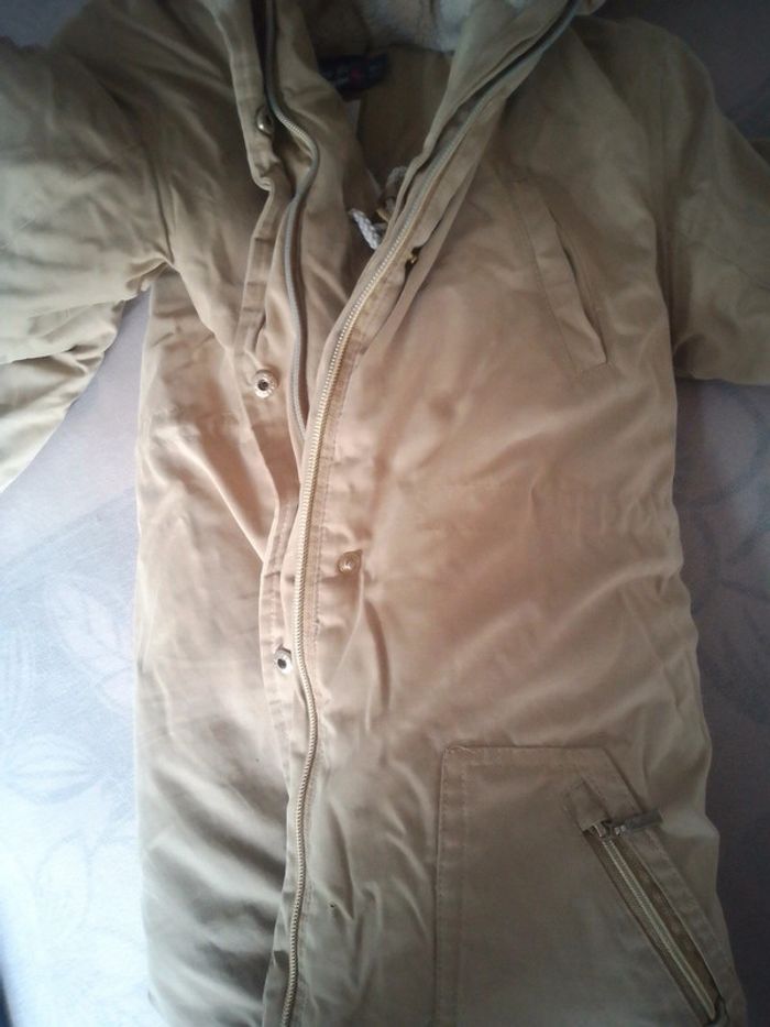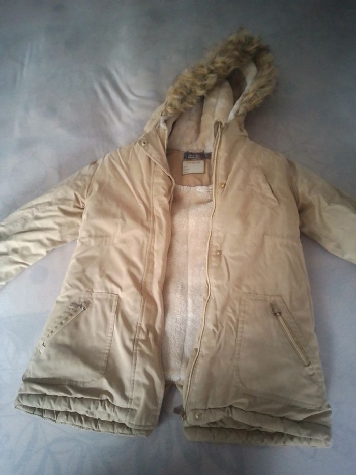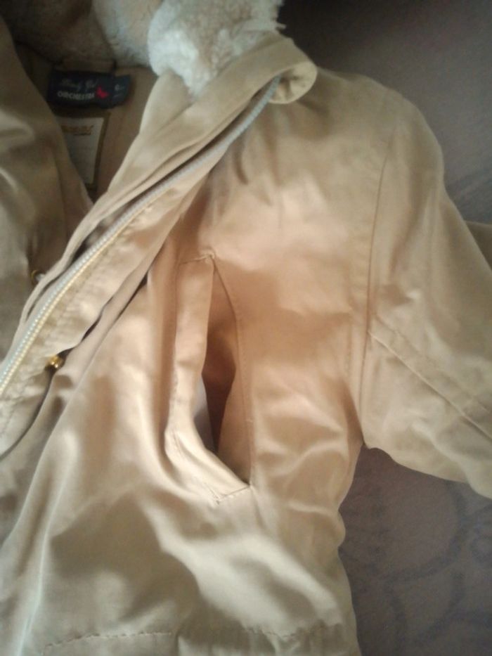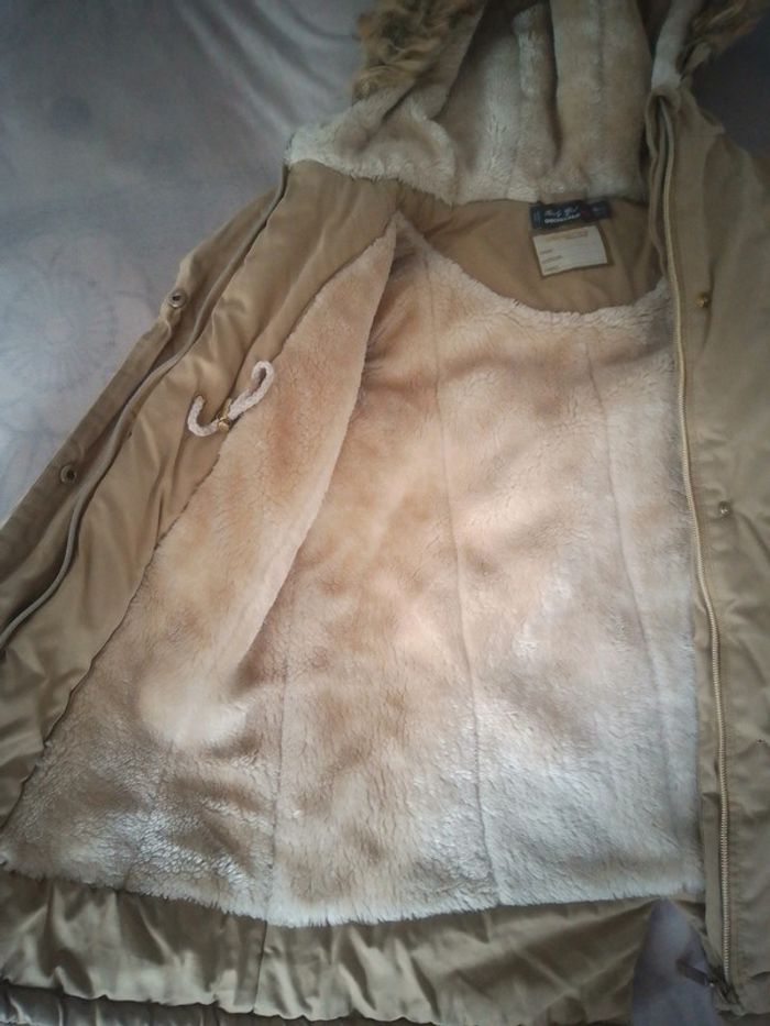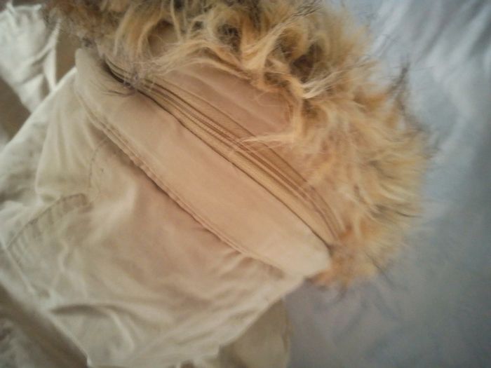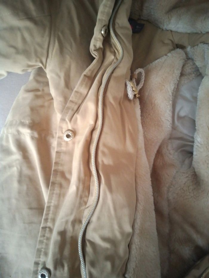 Manteau fourrure intérieure Cordon de serrage à la taille Fermeture éclair + pression Capuche qui s'enlève Très bon état hormis qu'il manque une pression voir photo