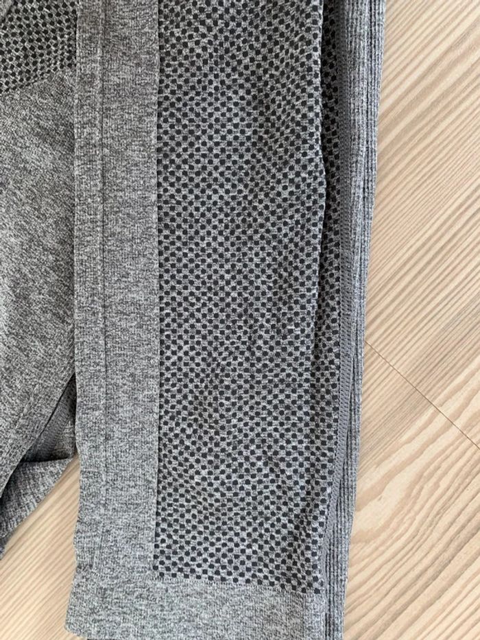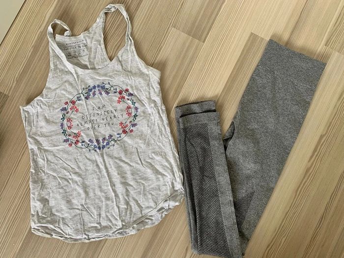 Débardeur dos nageur gris imprimé + Legging gris (présente seulement une tâche sur la ceinture mais se voit à peine voir dernière photo) Tbe 🌸réductions sur les lots 🌸