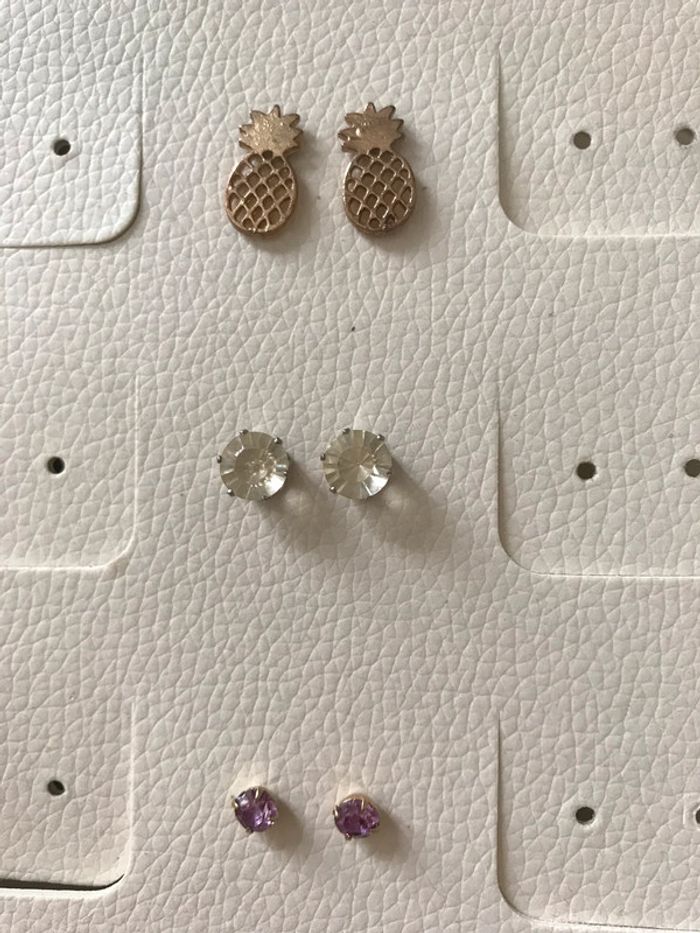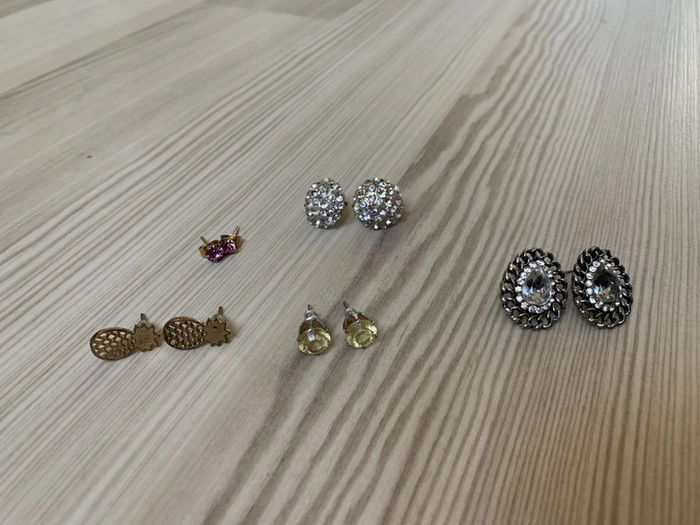 - 2 paires argentées avec strass - une paire doré ananas - une paire de clous violet - une paire de clou jaune transparent 🌸réductions sur les lots 🌸