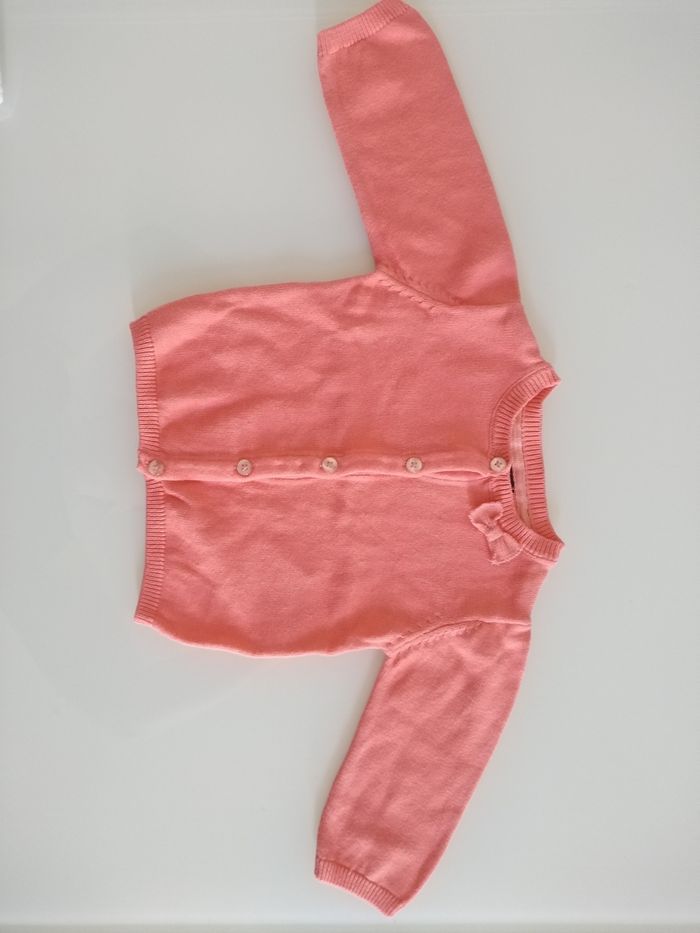 Gilet manches longues qui se ferme devant Couleur saumon/corail Petit noeud sur le devant Marque KIABI Taille 6 mois, 63-69 cm, 8 kg Très bon état