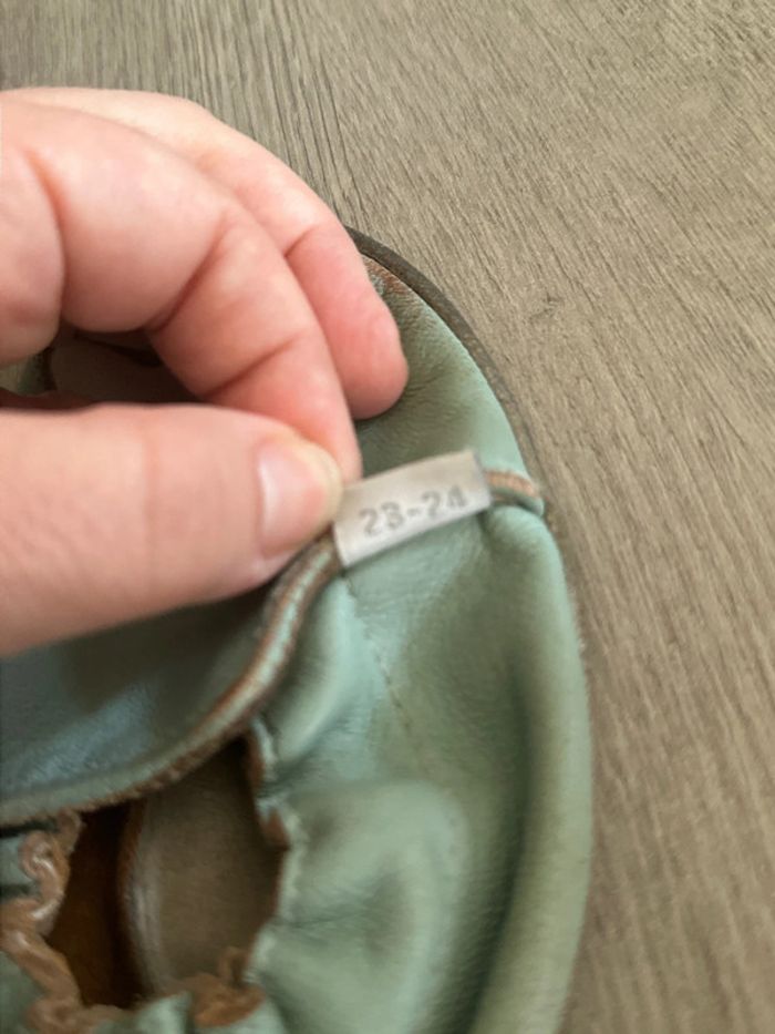 Chausson porté en intérieur. Abîmé sur le devant mais pas gênant pour rester dans la maison . Taille 23-24 #chaussoncuir #fille #garçon