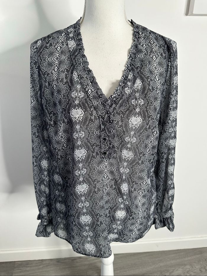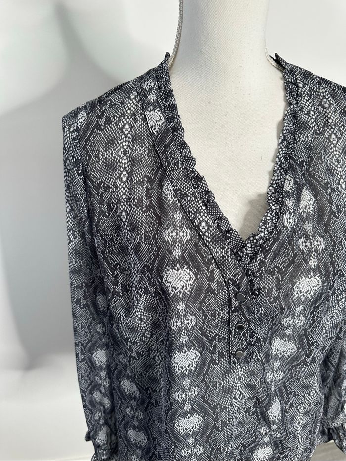 Blouse - Excellent état - Taille 38 équivalent M Dimensions en bas de l’annonce - Marque NafNaf - Col en V - Imprimés python serpent - Manches longues - Gris, noir et blanc - 100% Polyester Dimensions: - 52cm niveau aisselles - 64cm de long