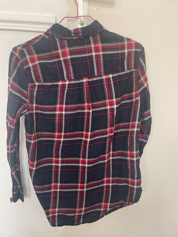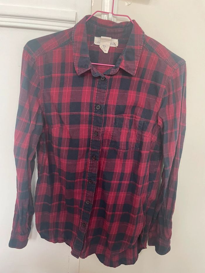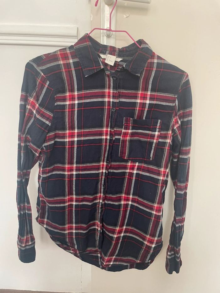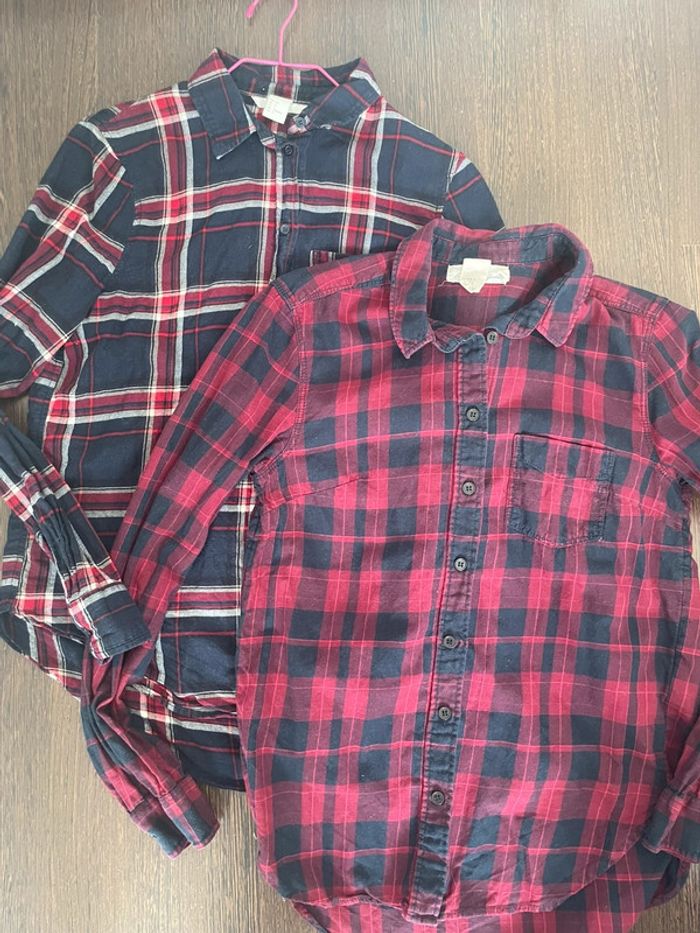Lot de 2 chemises taille 34 rayées rouge et bleu (taillent grand, plutôt 34-36), de la marque H&M. Pan plus long à l’arrière. Souvent portées, en bon état.