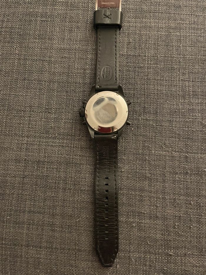 Montre Fossil modèle Chronograph avec bracelet en cuir noir, livrée dans sa boîte d’origine en fer. Fonctions chronomètre + date et heure. A noter: le bracelet a été très peu porté et la pile est à changer.