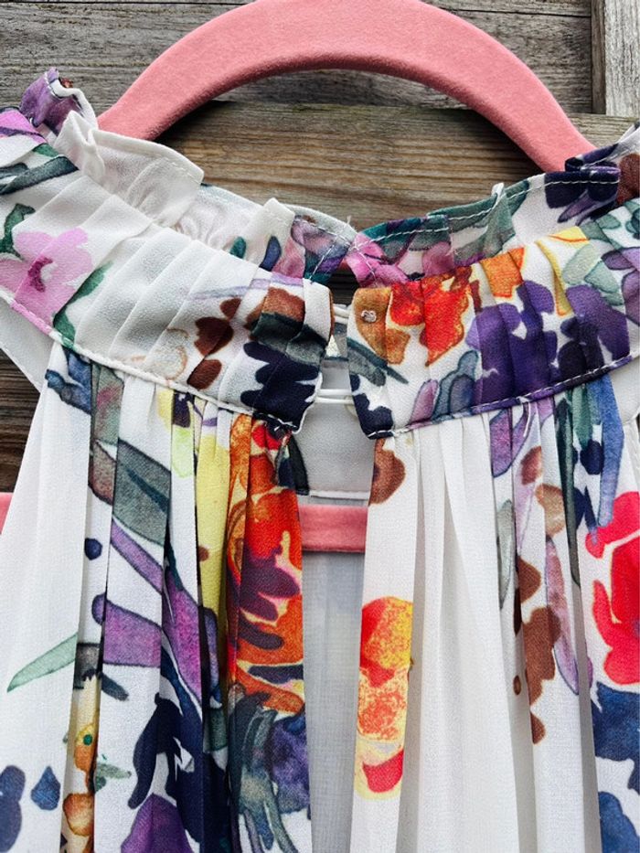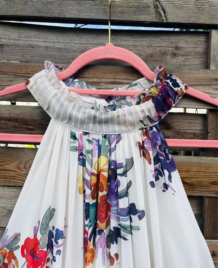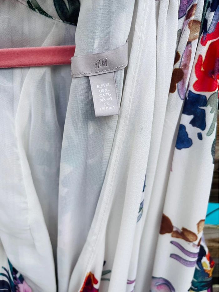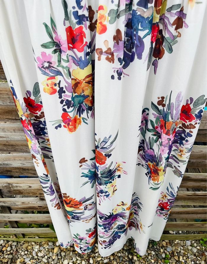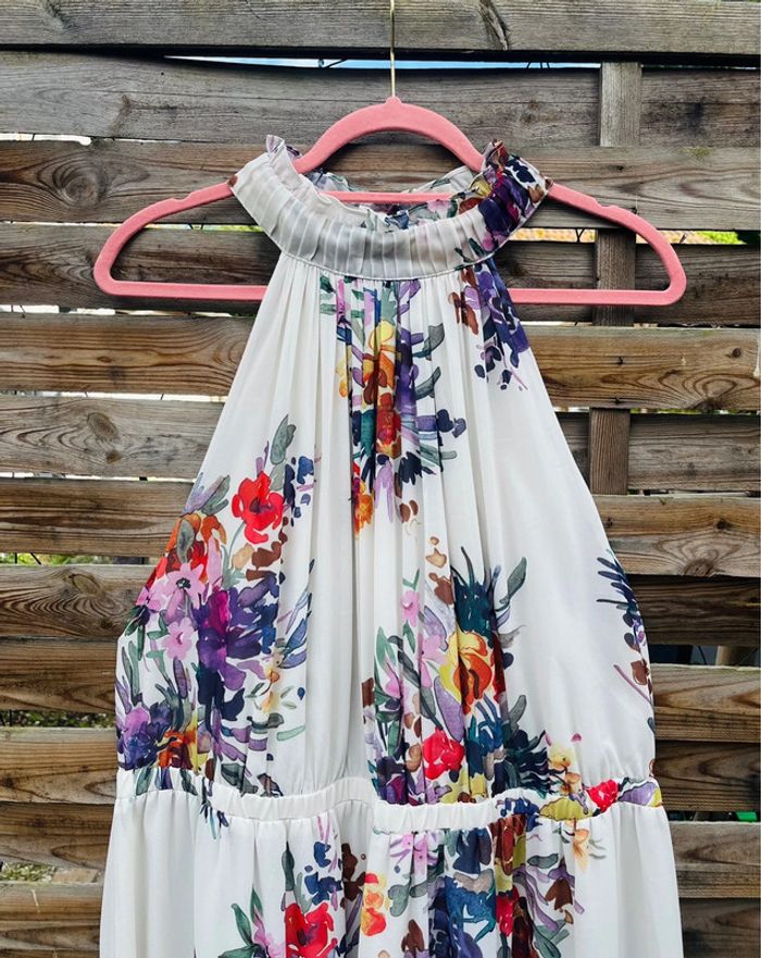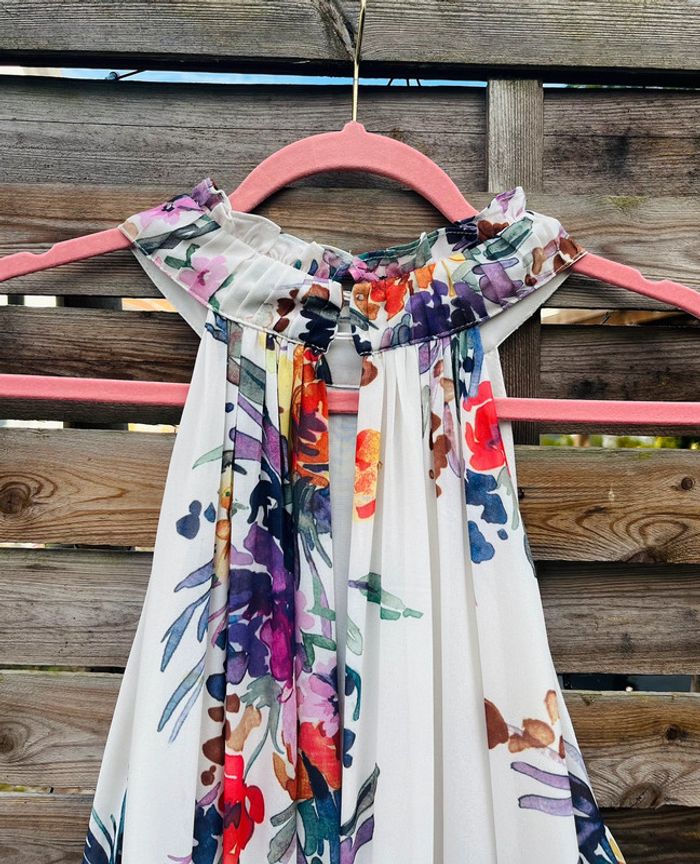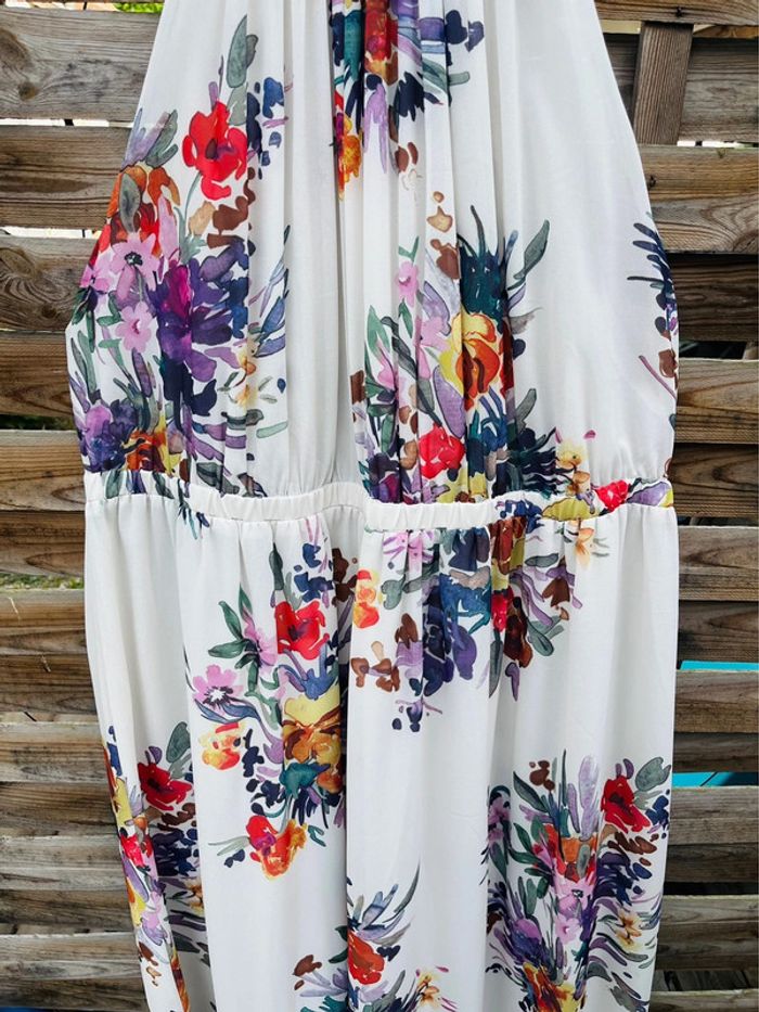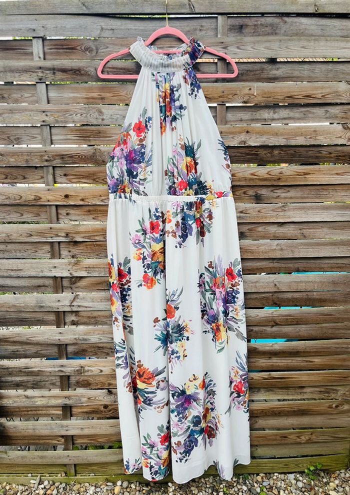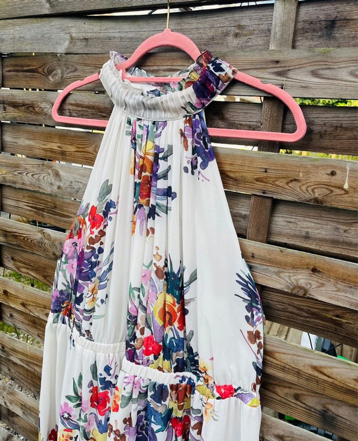 Robe longue blanche à épaules dénudées Motifs fleuris colorés S’attache autour du cou avec 2 boutons Haut du dos légèrement ouvert H&M / TAILLE XL / NEUVE SANS ÉTIQUETTE Achetée 59.99€ en magasin.