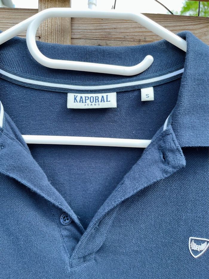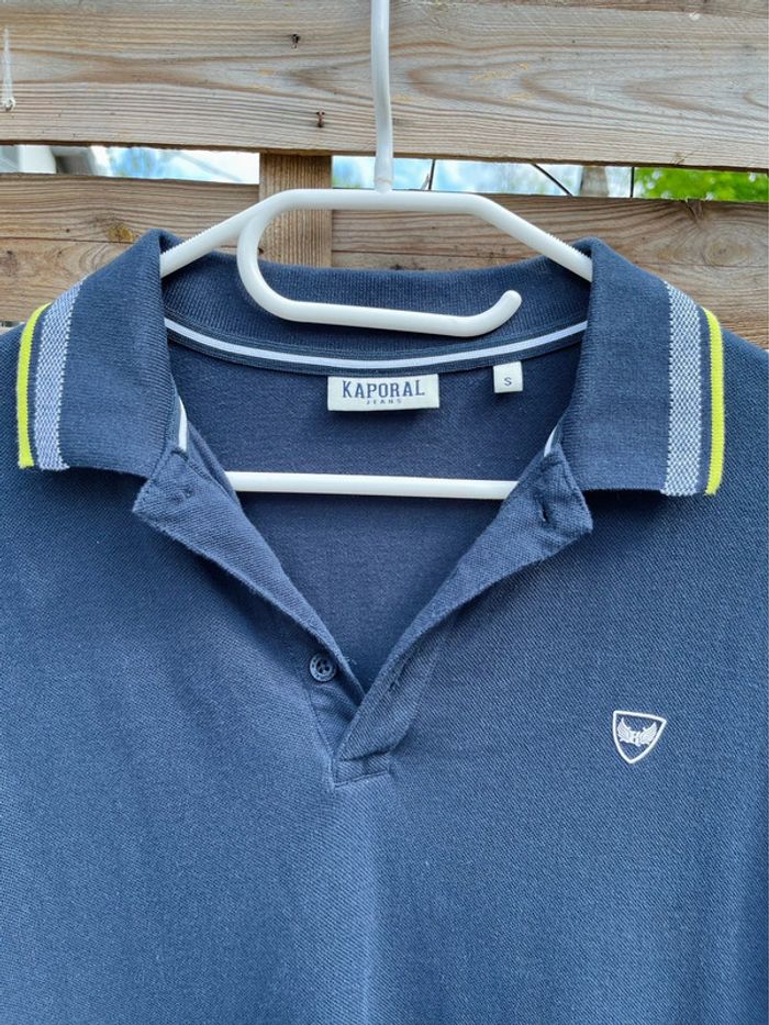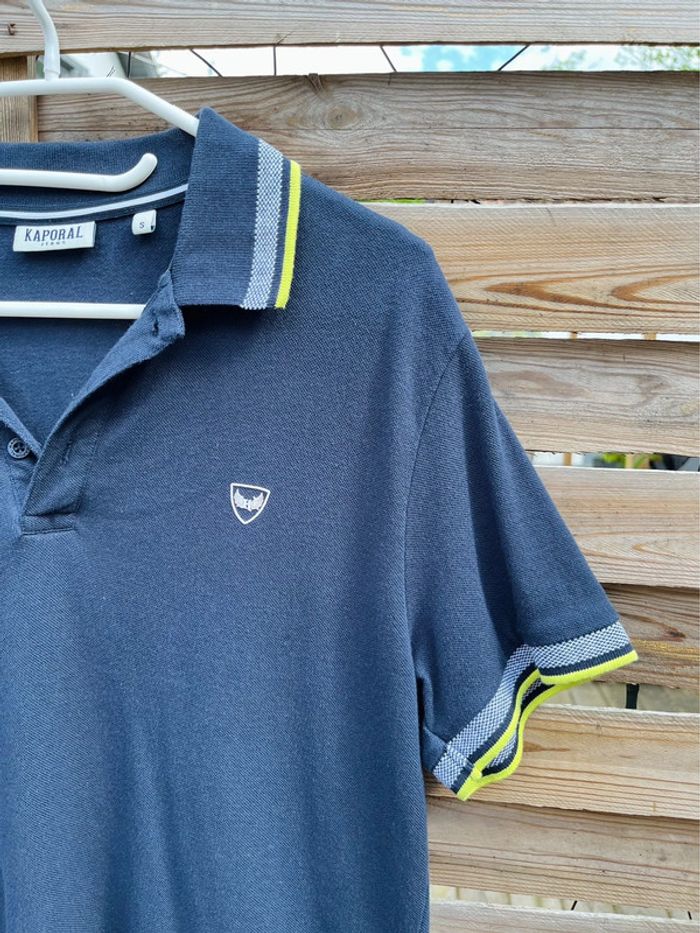 Polo bleu marine KAPORAL JEANS Liseret vert fluo sur le col + les manches KAPORAL / TAILLE S / TRES BON ÉTAT Acheté 49€ en magasin.