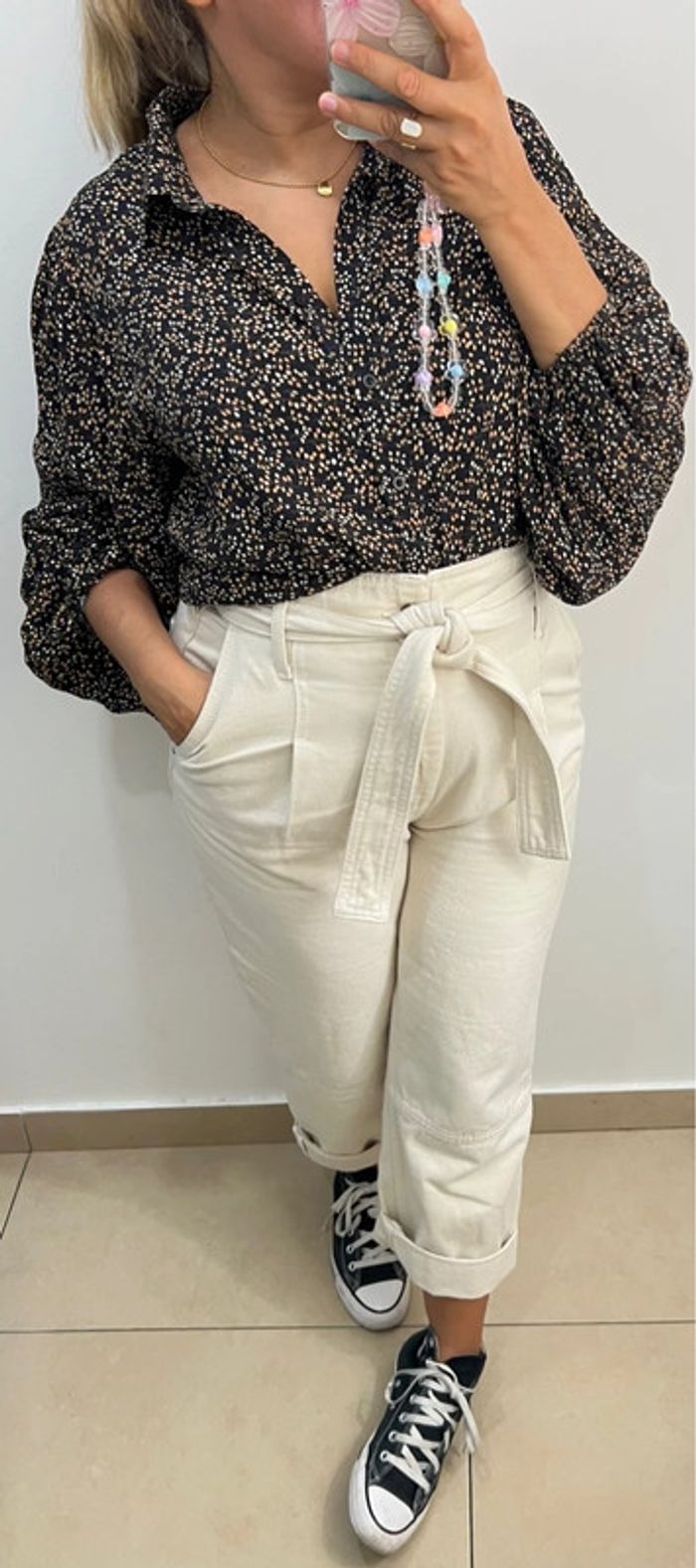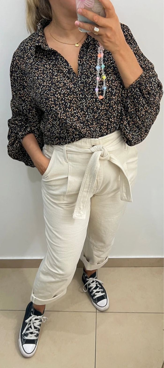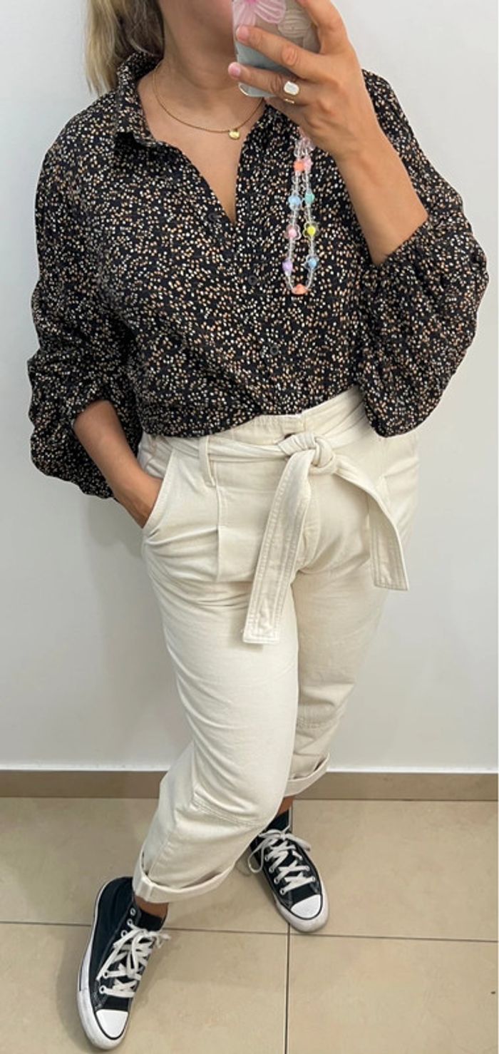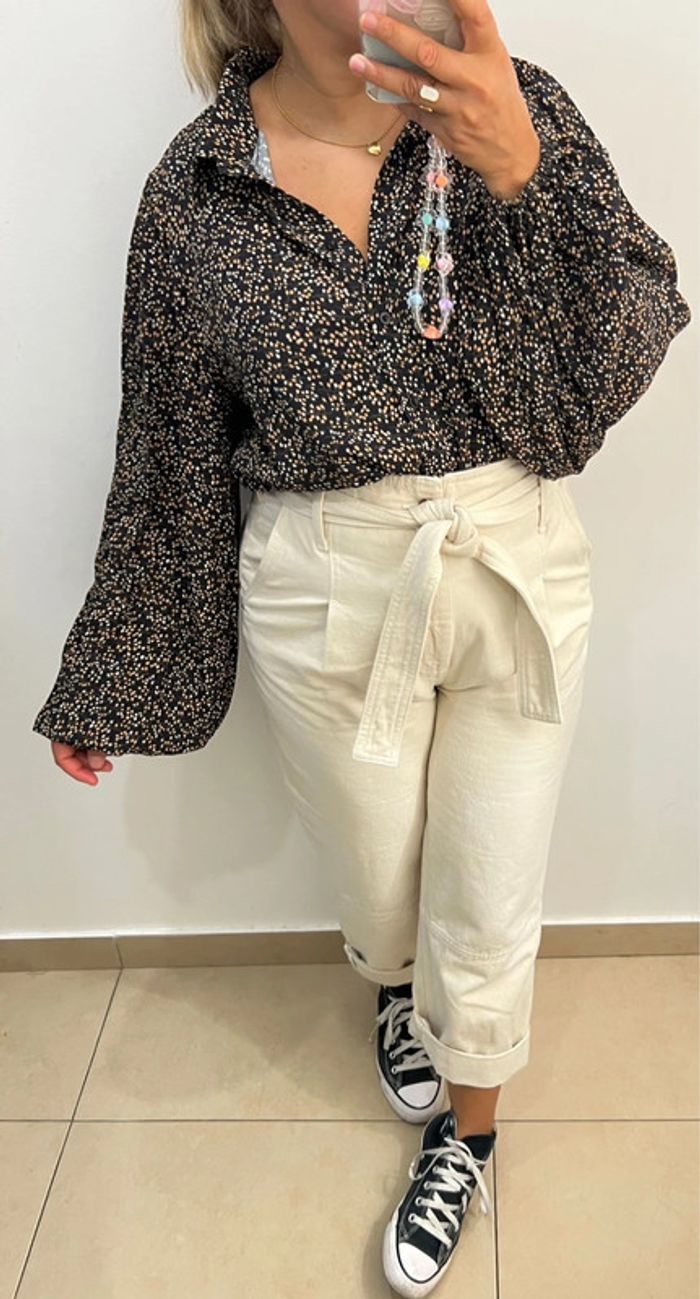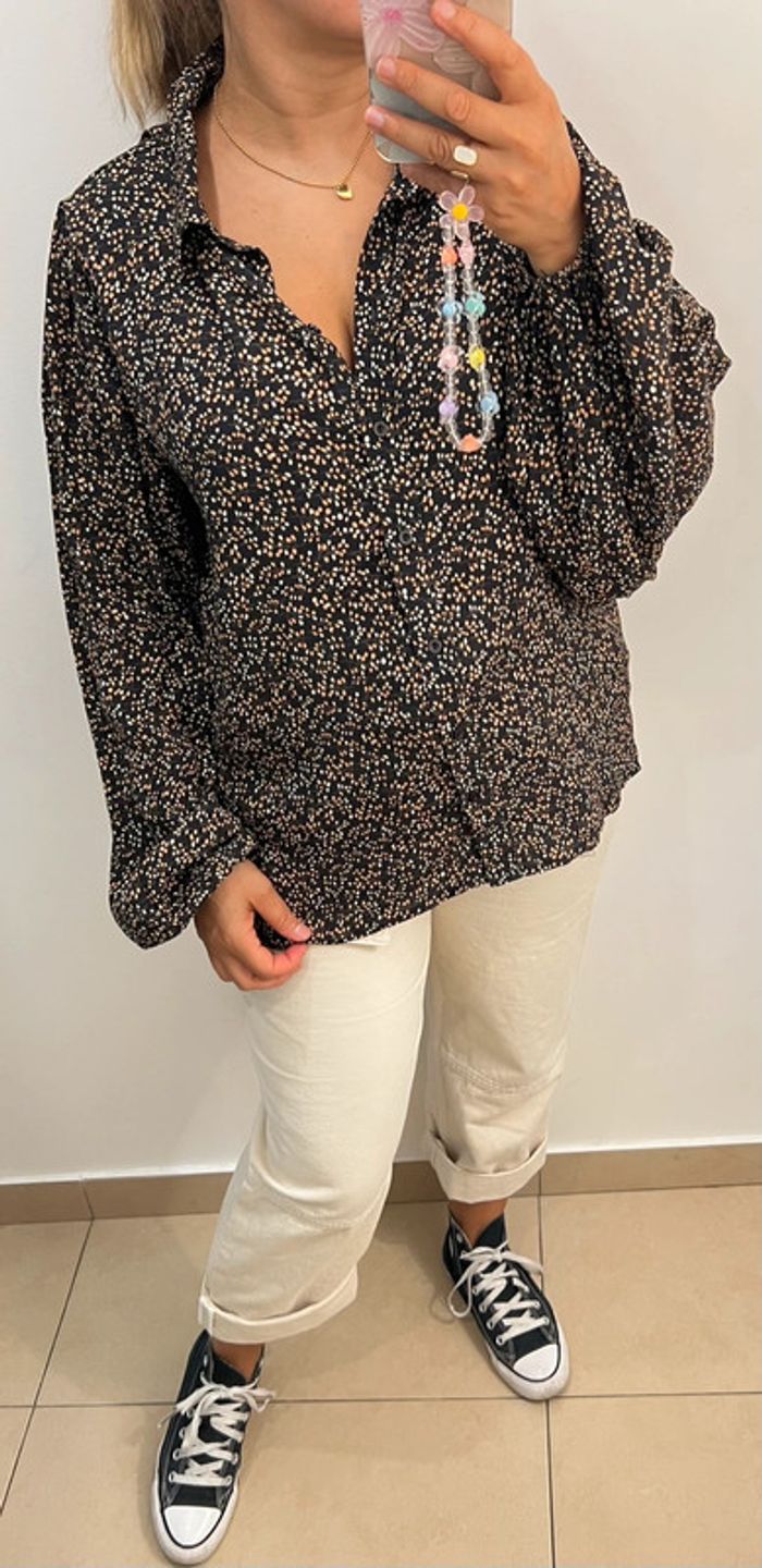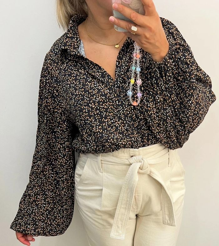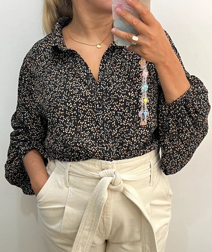 Chemise fluide imprimée pois Manches longues bouffantes avec poignets élastiques Taille indiquée 38 Longueur 63cm Largeur épaules 40cm Largeur aisselles 53cm En viscose