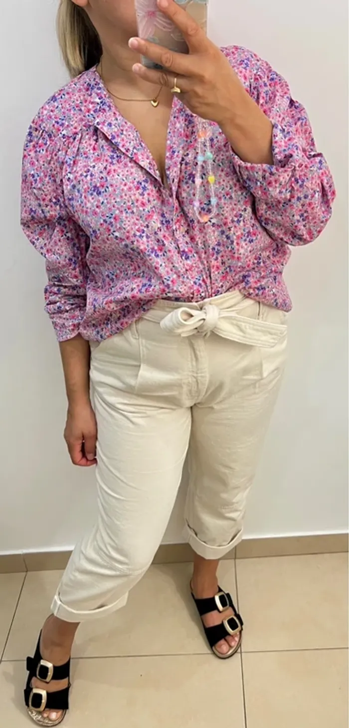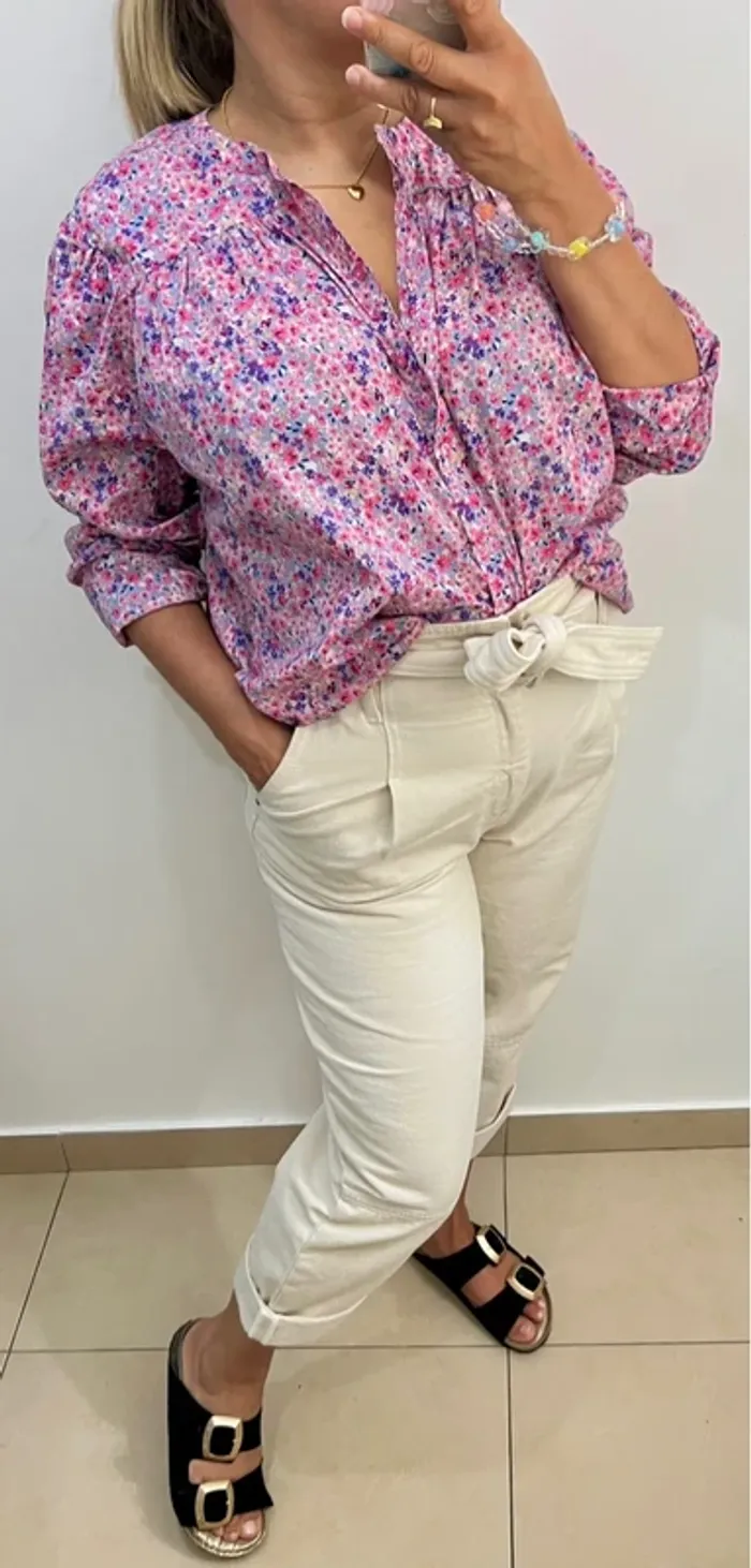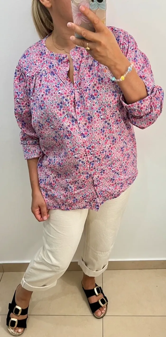 Chemise fleurie col mao Taille 36 mais convient aussi à un 38 Coupe ample ,légère Longueur 65cm Largeur épaules 39cm Largeur aisselles 60cm Modèle Xala En coton