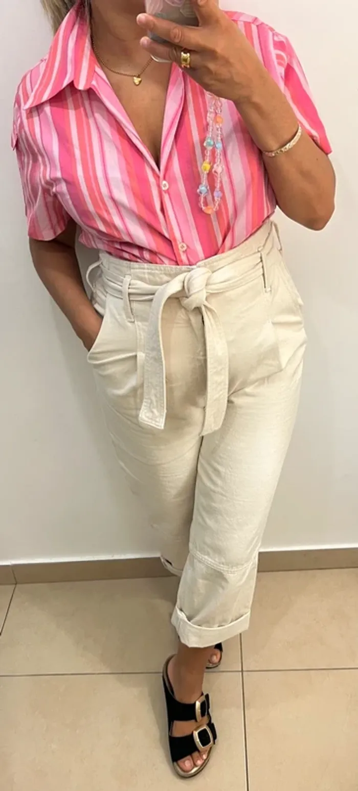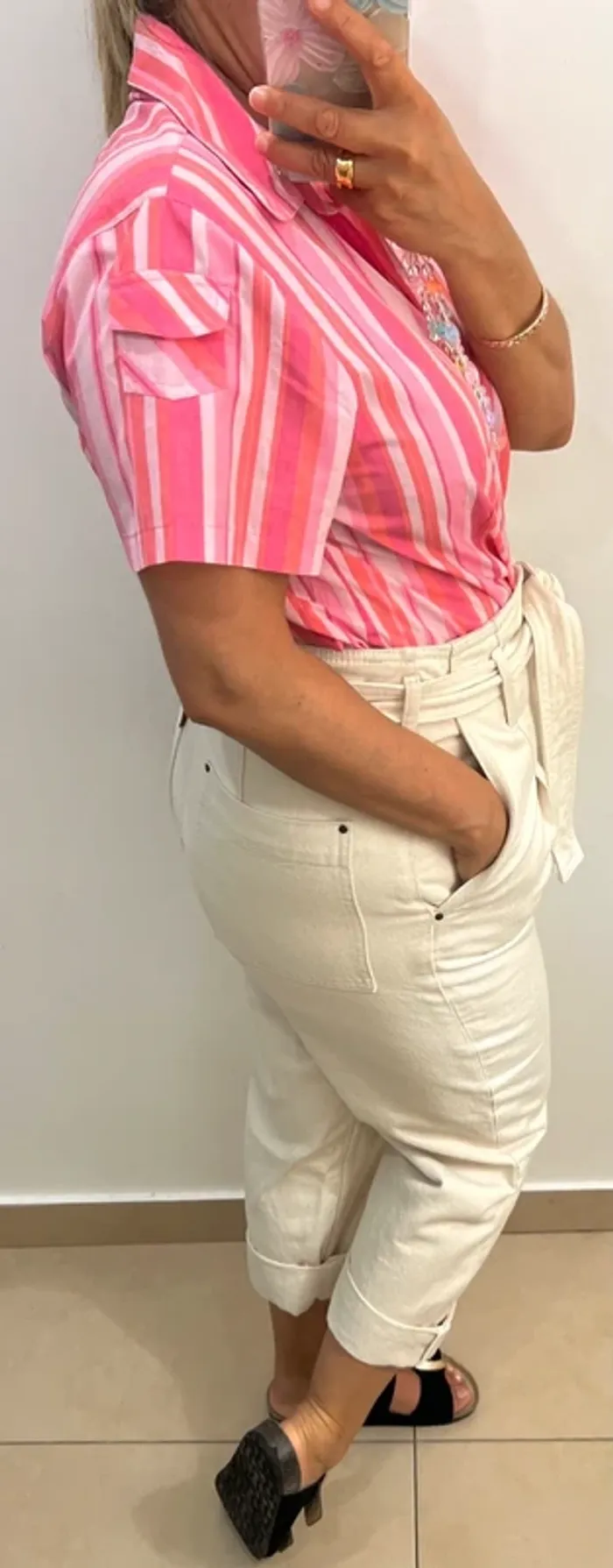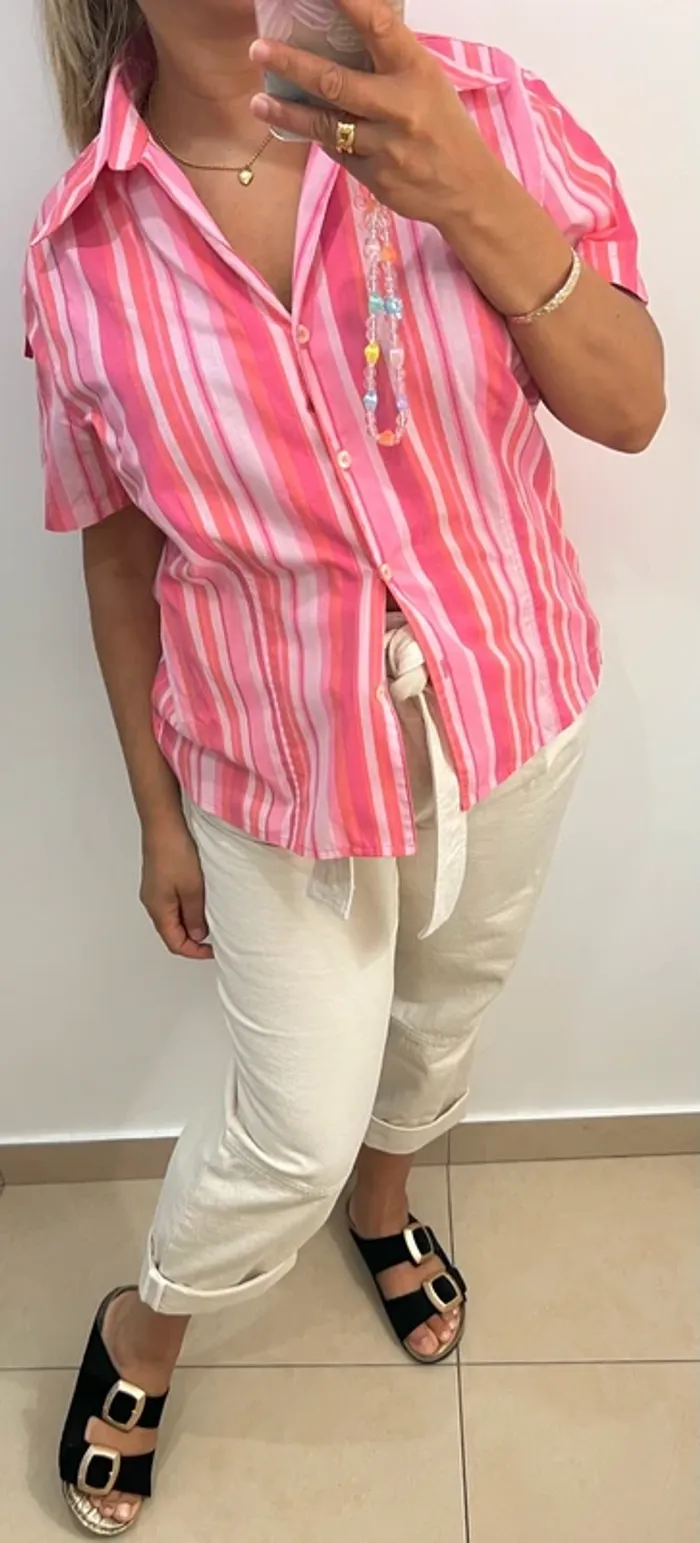 Chemise imprimée rayée cintré (taille indiquée 46 mais semble convenir à une taille 44 au vu des dimensions) Taille 44 Longueur 60cm Largeur épaules 43cm Largeur aisselles 54cm 52% Coton 48%polyester
