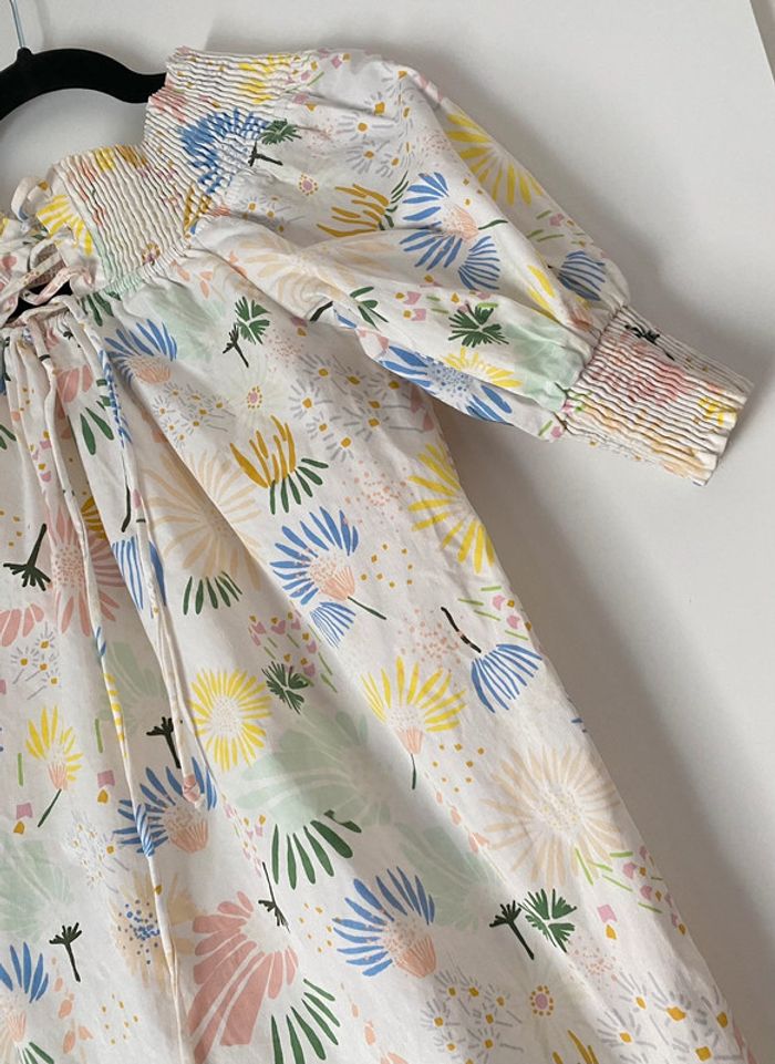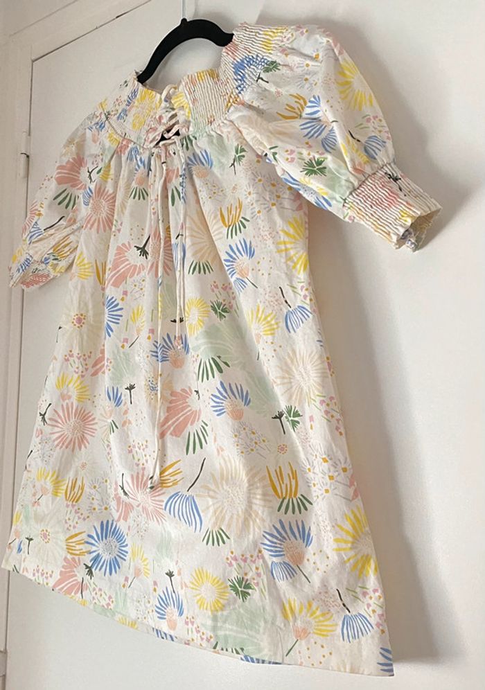 Robe Courte Ou Tunique Imprimée Fleurs Demie Manches Resserrer Par Elastique Encolure Extensible Jusqu'à 60Cm Dos A Nouer Taille M Longueur 70Cm Largeur Aisselles 50Cm Largeur Taille 53Cm Non Doublé Tissu Opaque Ceinture Non Comprise En Coton Et Elastane