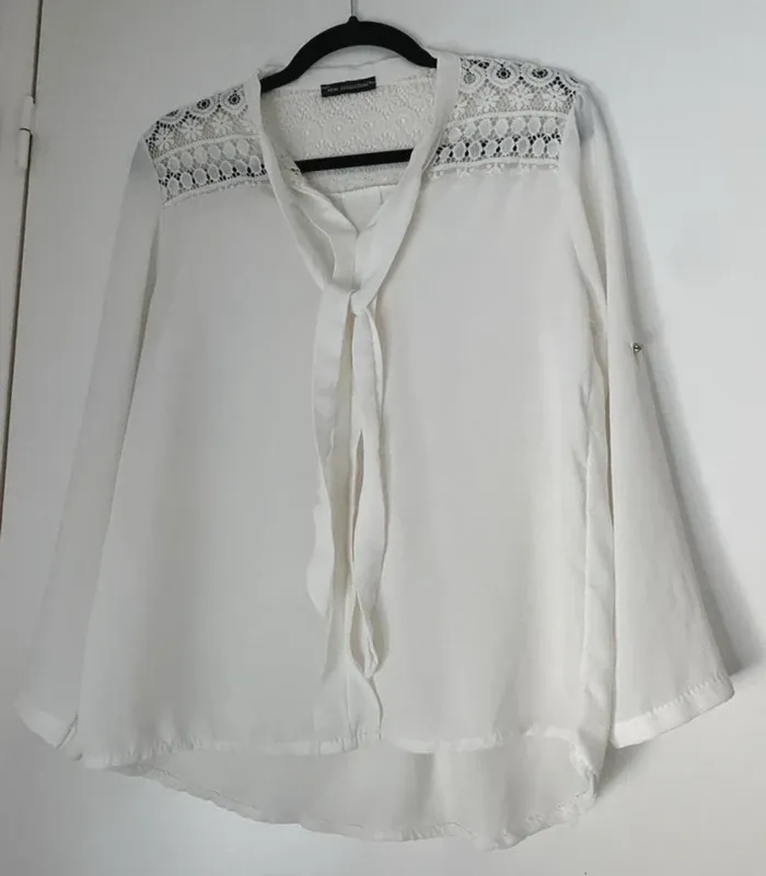 Blouse brodée Col V a nouer Taille Unique longueur 58cm devant 68cm derrière Largeur épaules 40cm Largeur aisselles 50cm En polyester