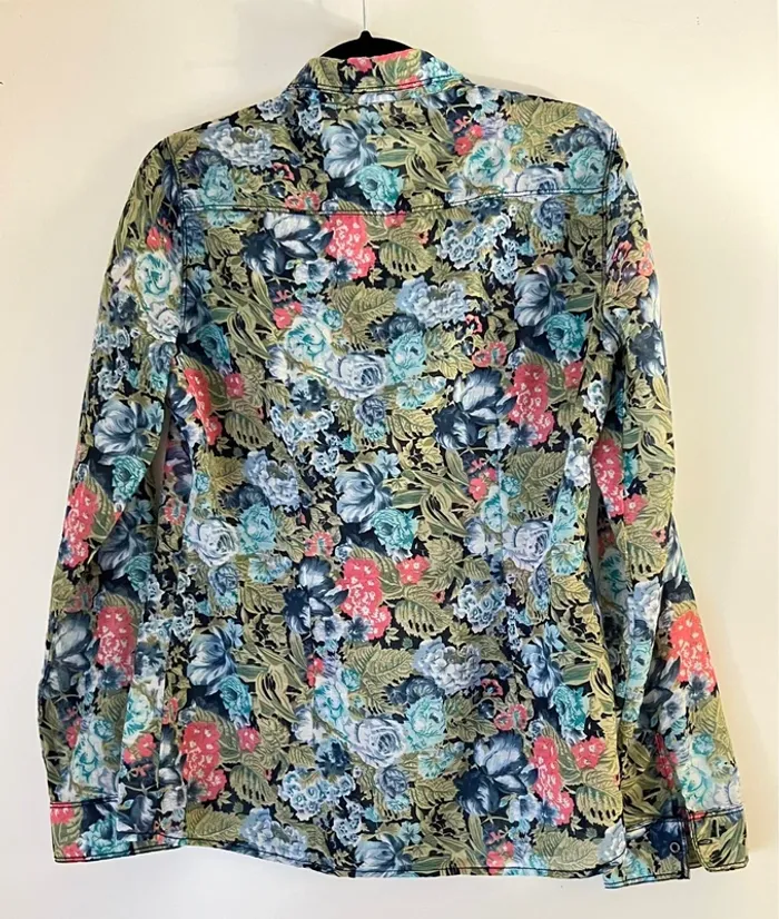 Chemise légère à fleurs Taille Indiquée L taille petit semble être une taille S longueur 63cm Largeur aisselles 46cm Légèrement transparente