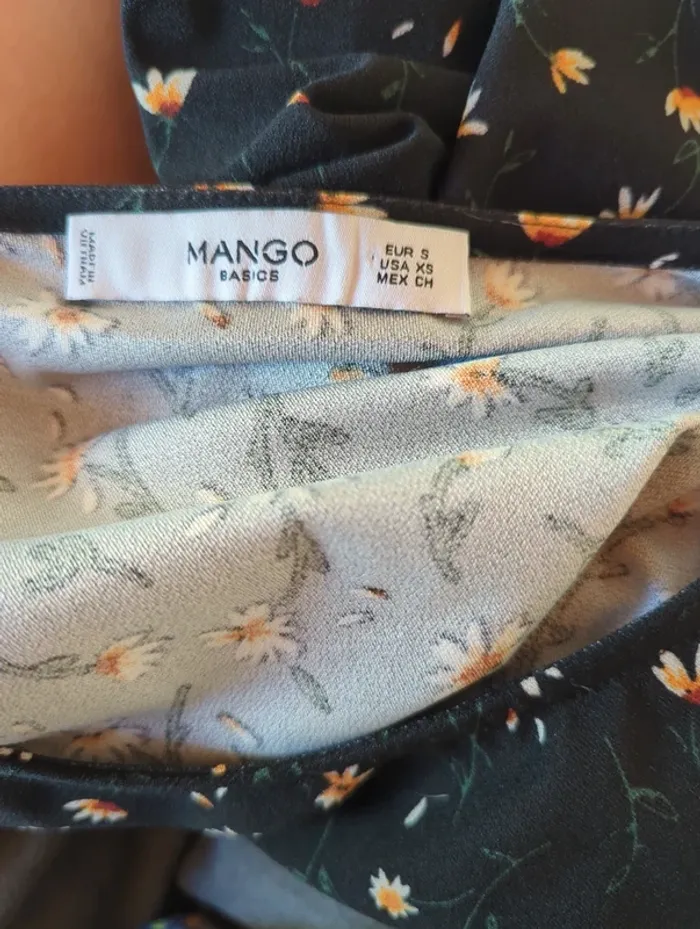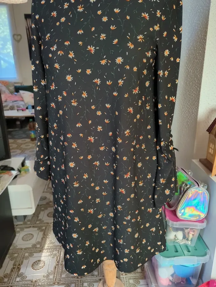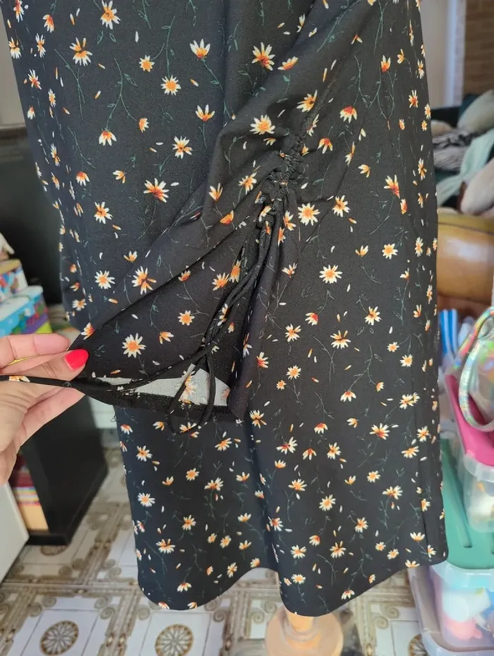 Robe noire manches longues, Motifs pâquerettes, Taille S, Cordons qui resserrent au niveau des manches Vintage