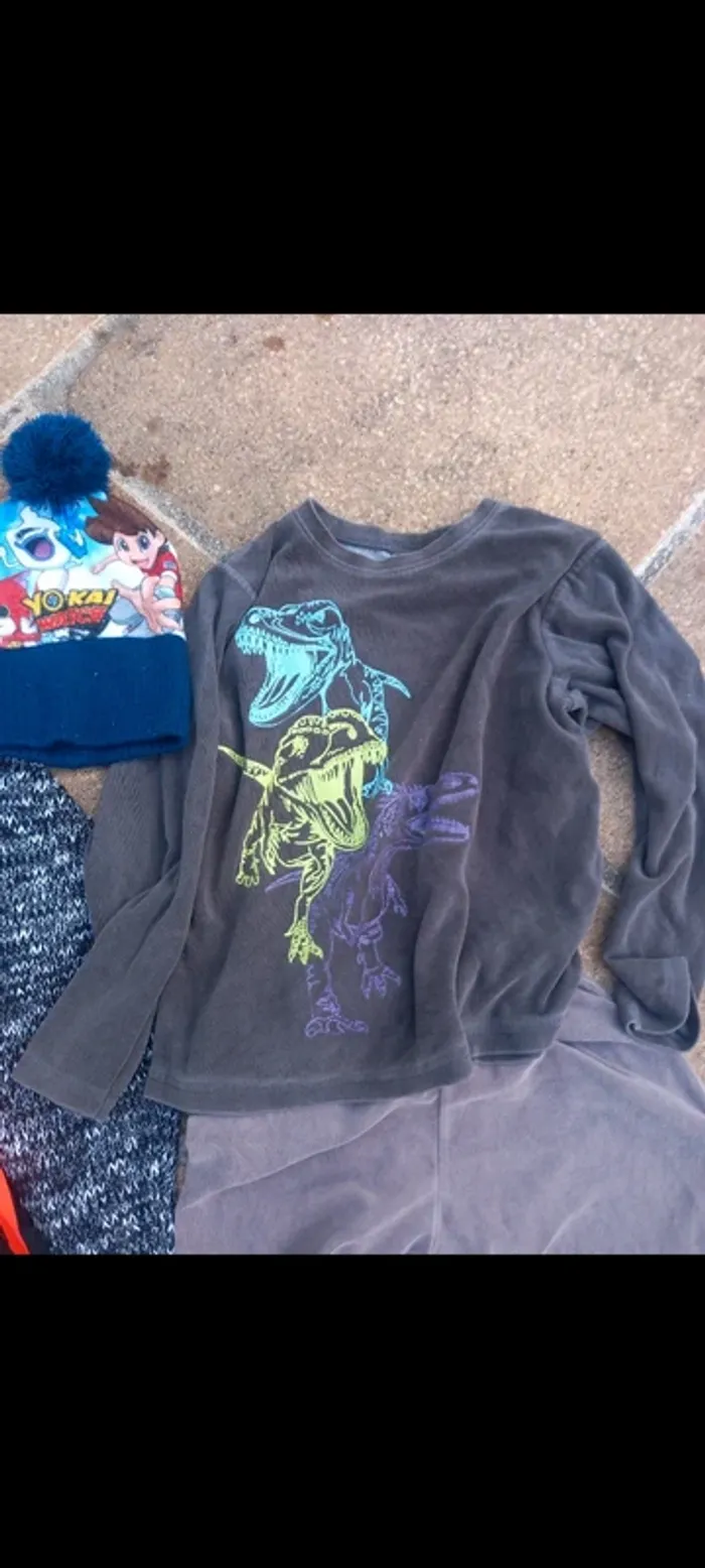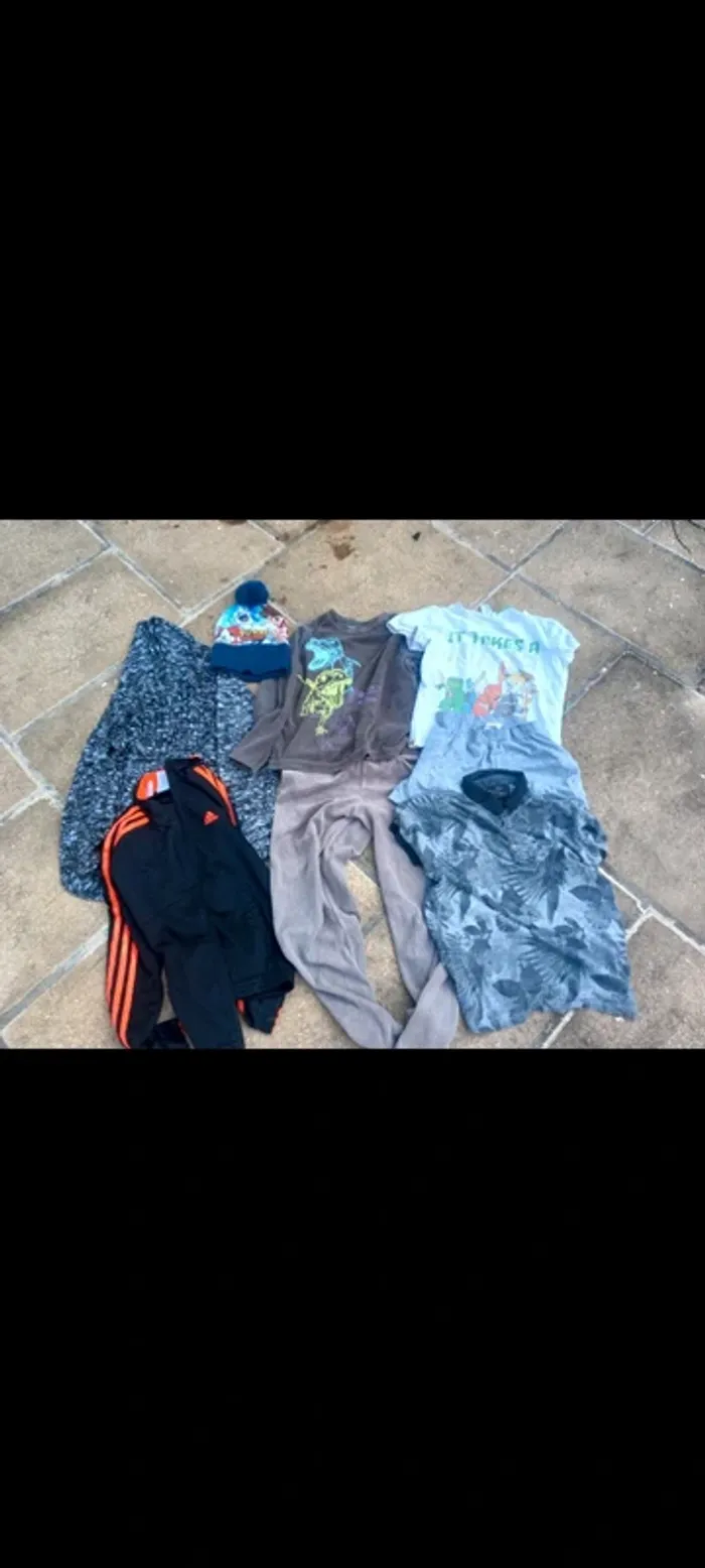 7 vêtements 10 : un pyjama d'hiver 2 pièces, un pyjashort 2 pièces, un polo, un bonnet et j'ai vendu le pull Zara à l'unité ainsi que la veste Adidas donc je mets un vêtements imperméable façon K-Way à la place