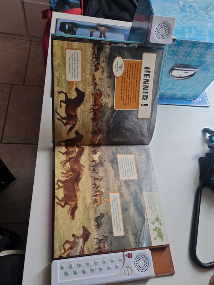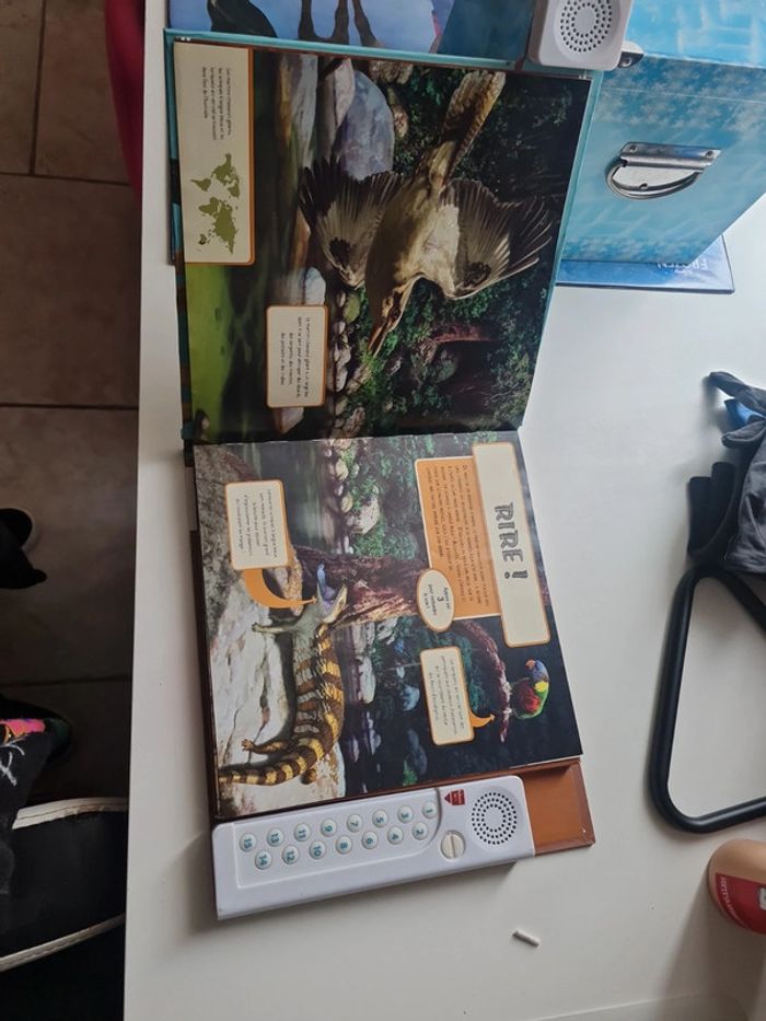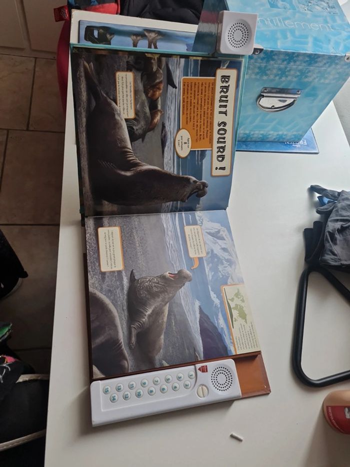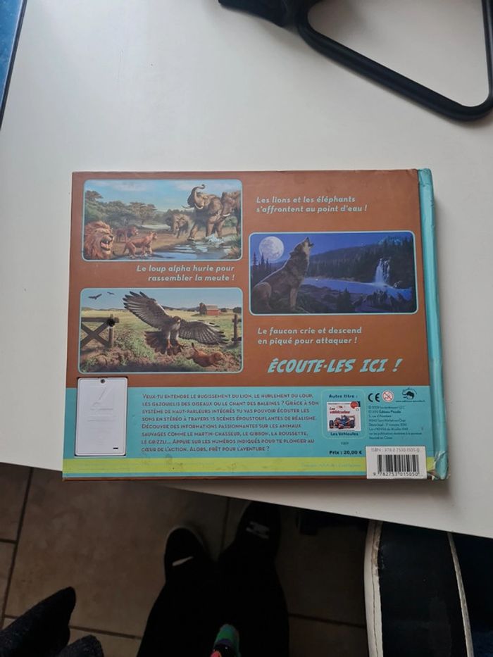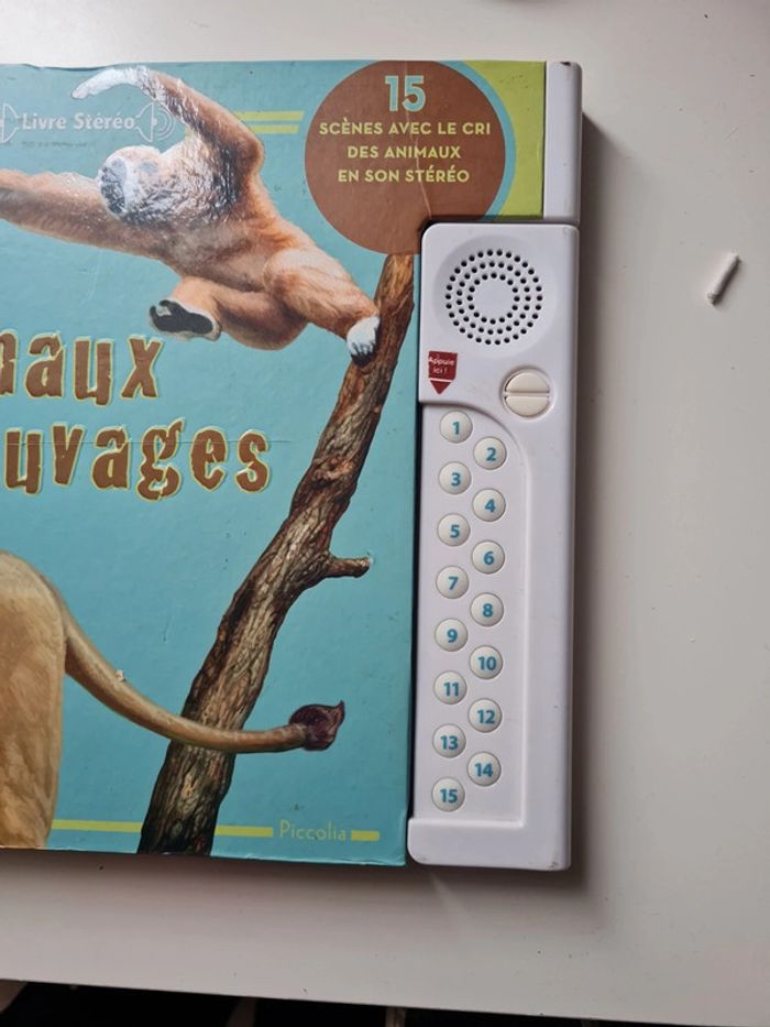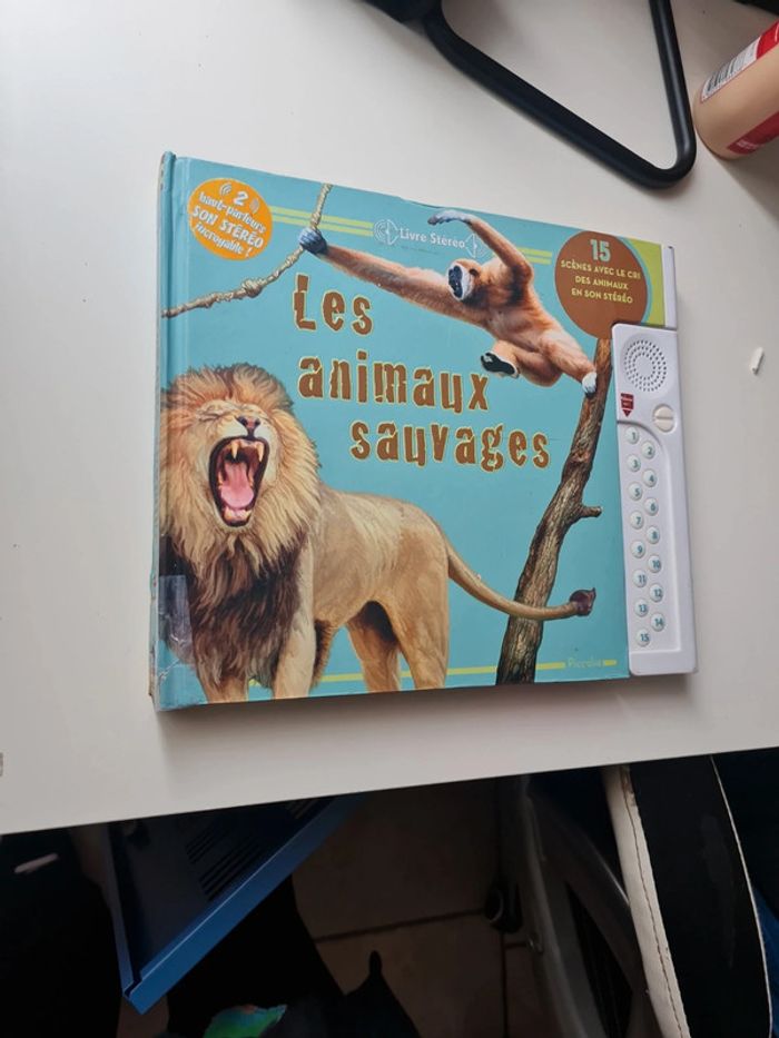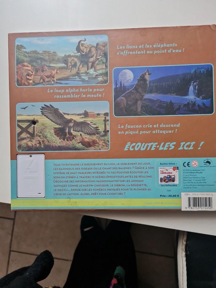 Livre sonore et réaliste avec 2 haut parleur pour un son stéréo incroyable. 15 cri différents. 3 piles format télécommande à mettre. Prix du livre en commerce 20€ Veux-tu entendre le rugissement du lion, le hurlement du loup, les gazouillis des oiseaux ou le chant des baleines ? grâce à son système de haut-parleurs intégrés tu vas pouvoir écouter les sons en stéréo à travers 15 scènes époustouflantes de réalisme. découvre des informations passionnantes sur les animaux sauvages comme le martin-chasseur, le gibbon, la roussette, le grizzli, appuie sur les numéros indiqués pour te plonger au coeur de l'action. alors, prêt pour l'aventure ? Livre scotché sur la tranche en bas mais rien de mechant ( dernière photo)