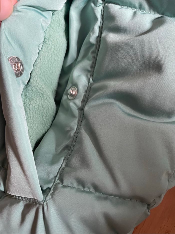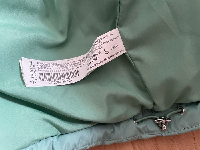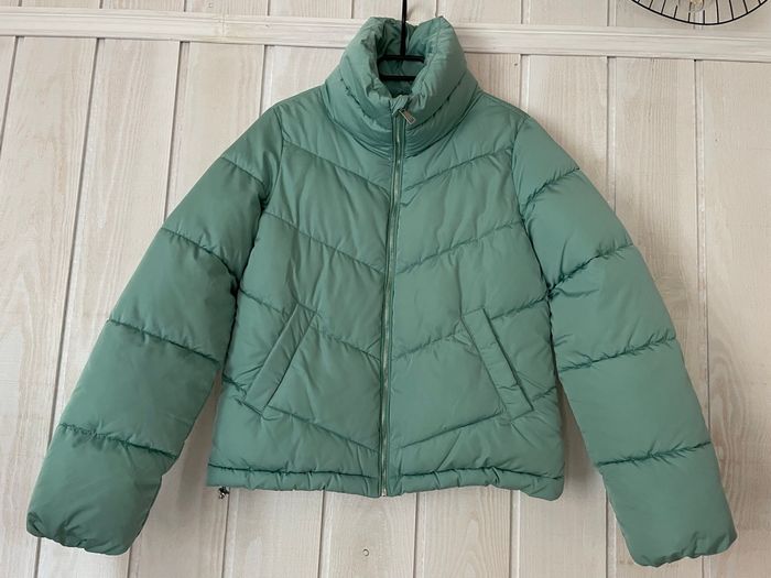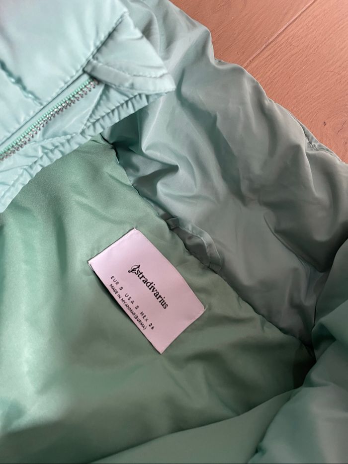 Doudoune couleur vert menthe 1 poche de chaque côté Resserrée aux poignets Marque Stradivarius Taille S A noter : un peu sali au niveau du resserrage poignets (cf photo)