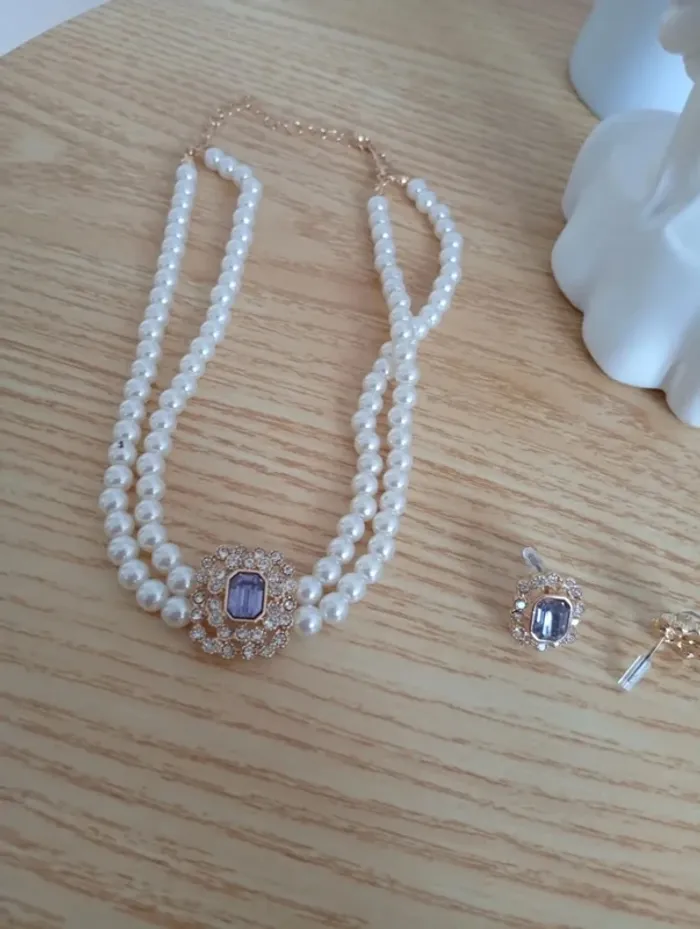 Ensemble fantaisie en perles blanches sophistiquées avec des boucles violettes doré pour fête - photo numéro 2