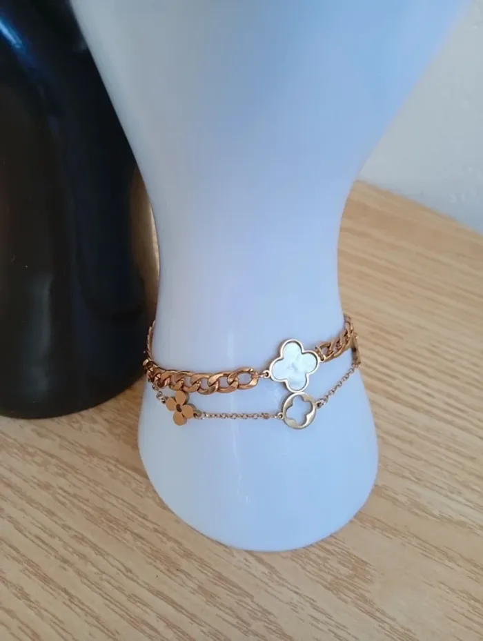 Solde 💝 Bracelet double trèfle 4 feuilles nacre fleurs  bohèmes chic tendance hippie - photo numéro 1
