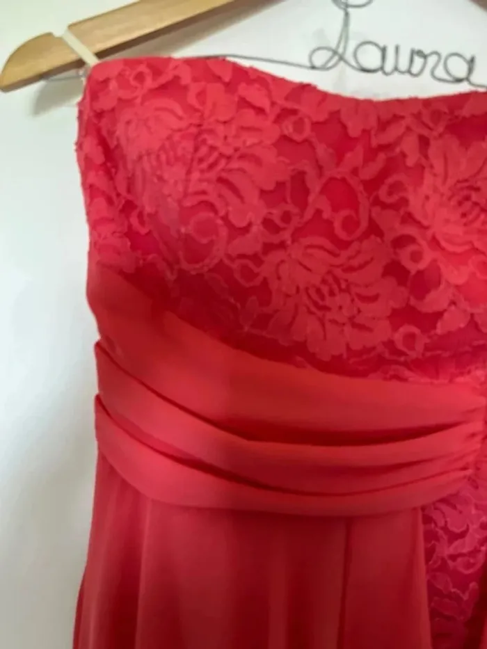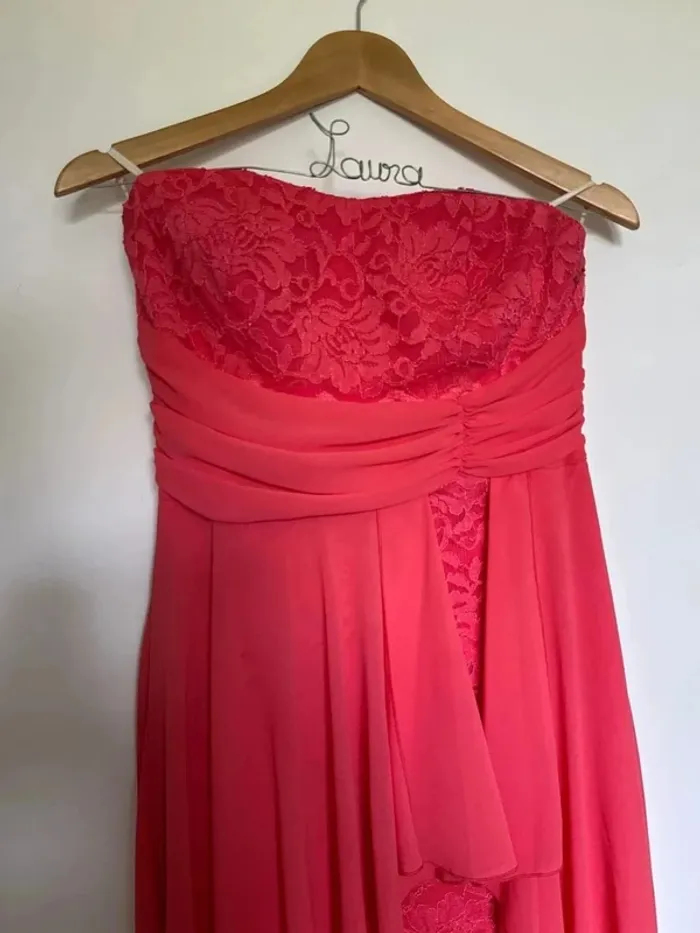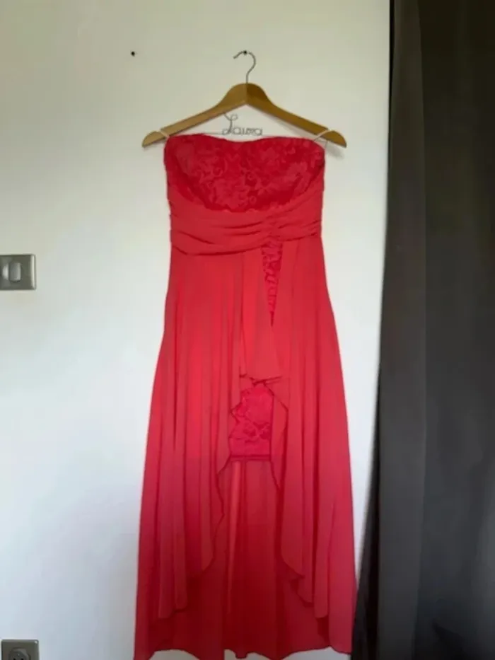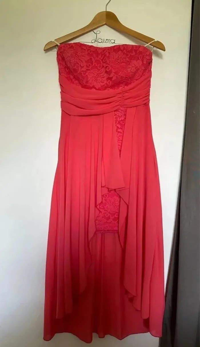Robe de soirée à la fois longue et courte Robe de cocktail sans bretelles corail Taille M Marque la scala ( achetée au USA) Très bon état Lot possible sur mon dressing #giuliafemmem