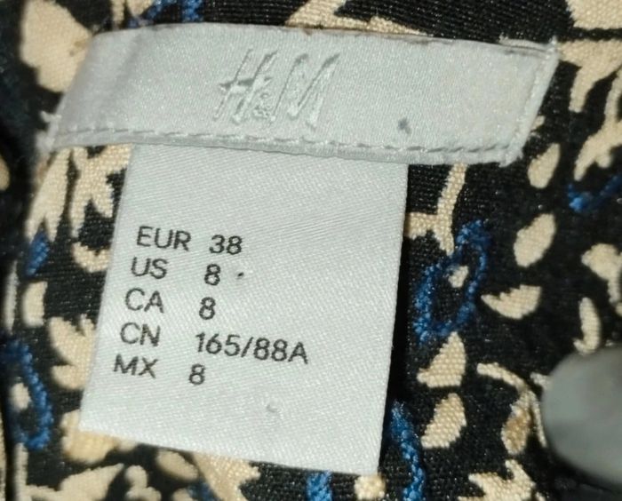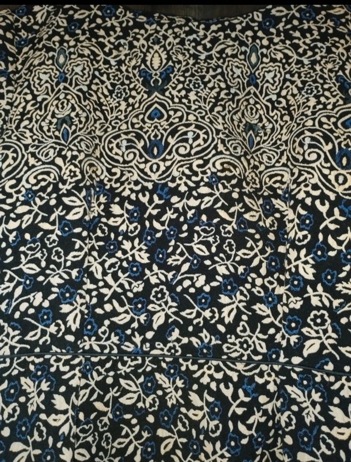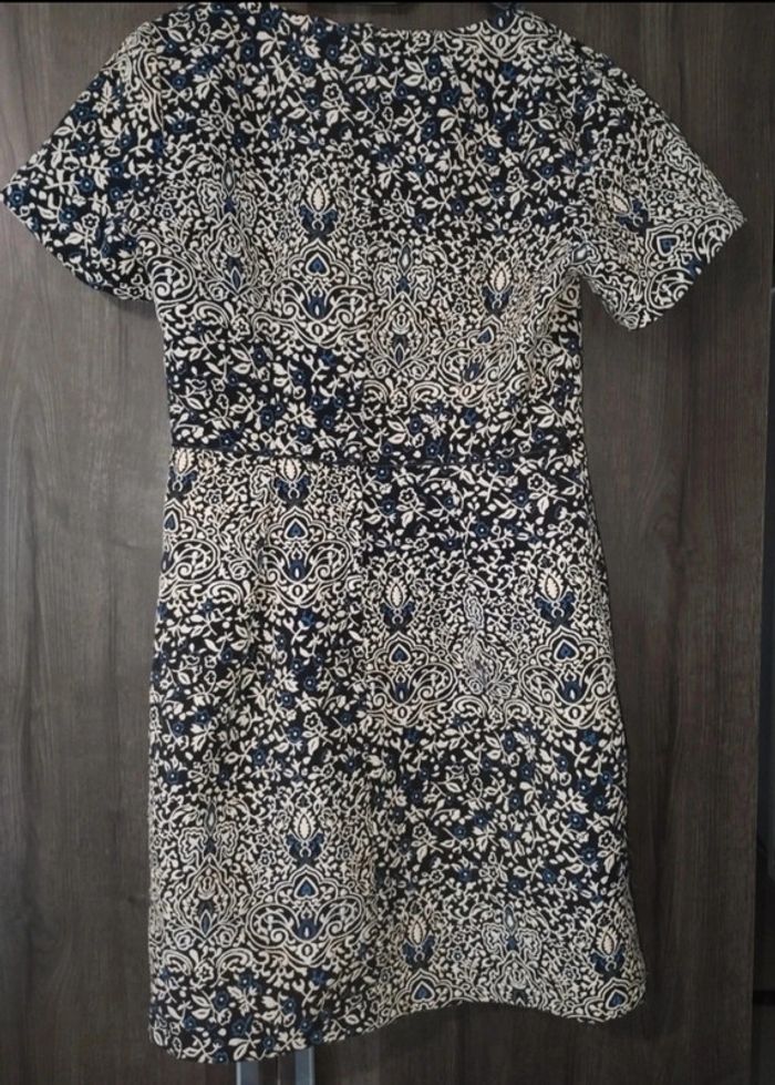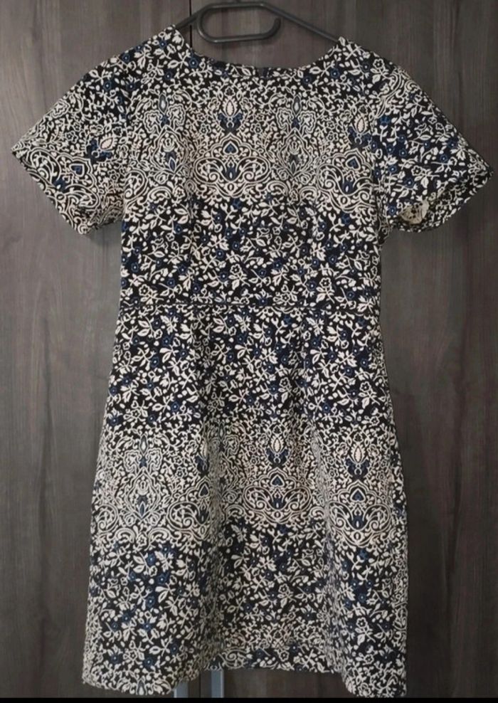 Robe à motifs fleurs et autres. Matière épaisse rendu qualité. Noir, motifs beiges et bleus. Très bon état . La forme met bien en valeur. H&M taille 38
