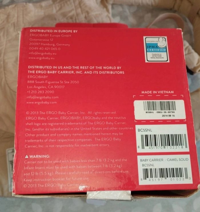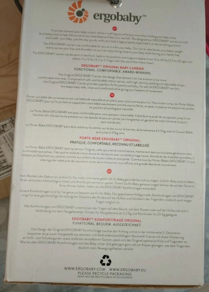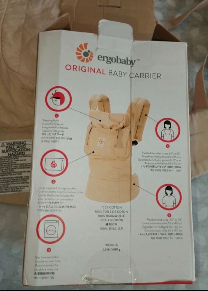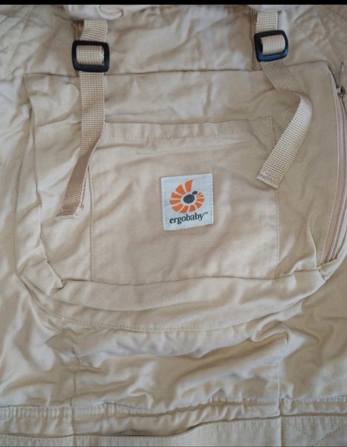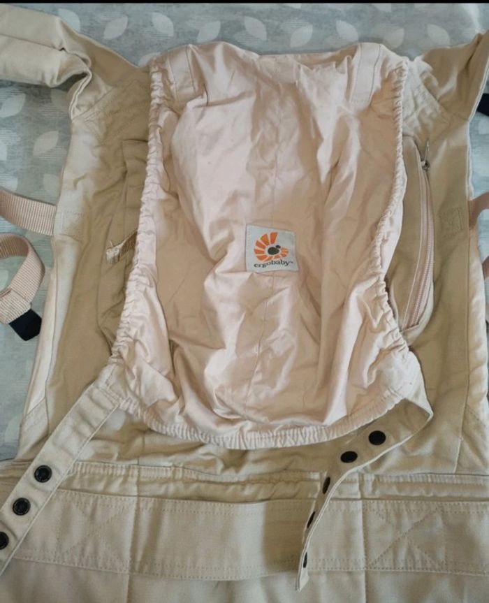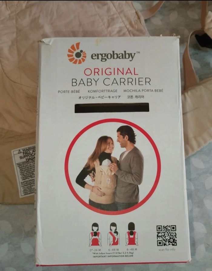 Porte bébé ergobaby original. État comme neuf car extrêmement peu utilisé. Avec sa boîte. Beige. Avec poche et capuche intégrée Portage de 0 à 48 mois, sur le ventre, le dos et le côté. Acheté 119 euros
