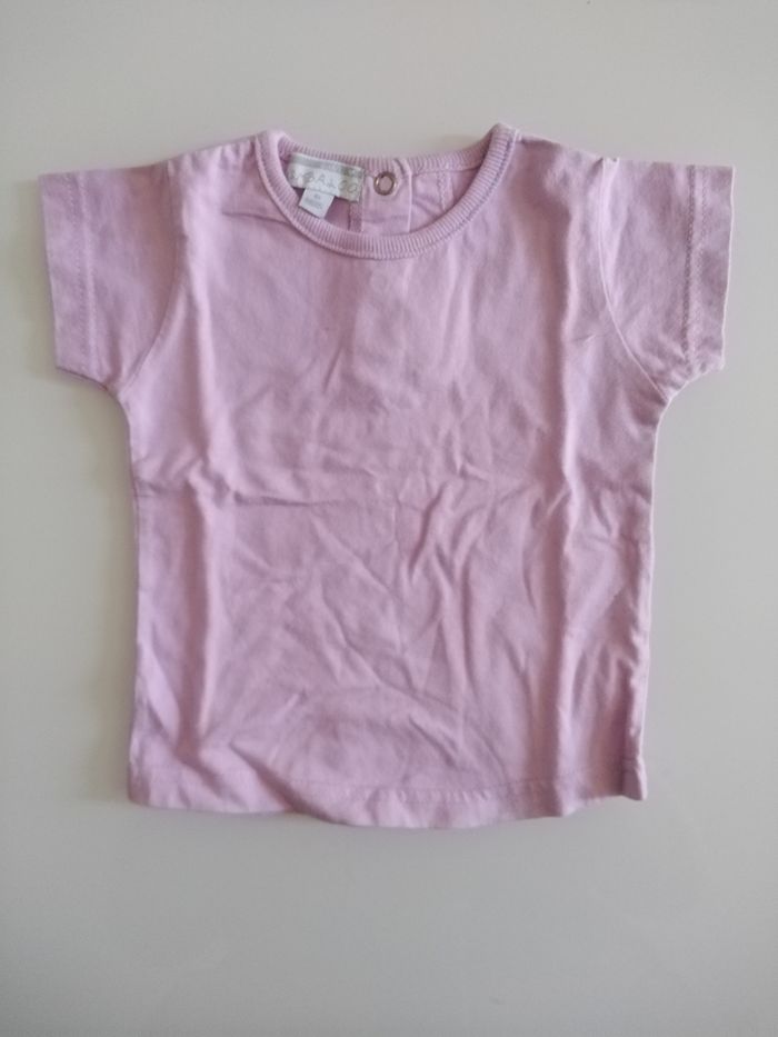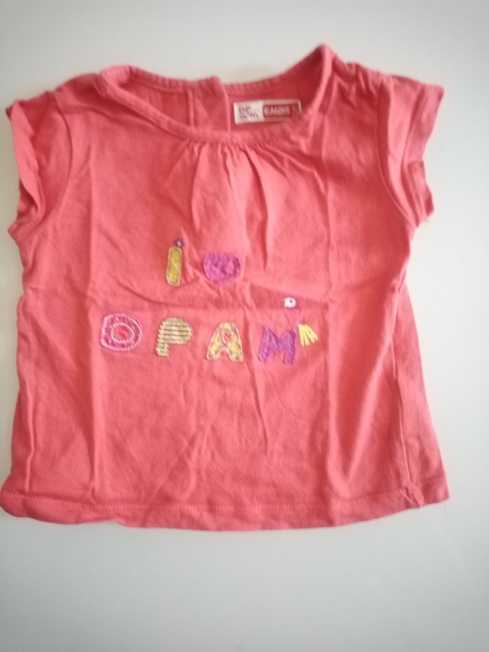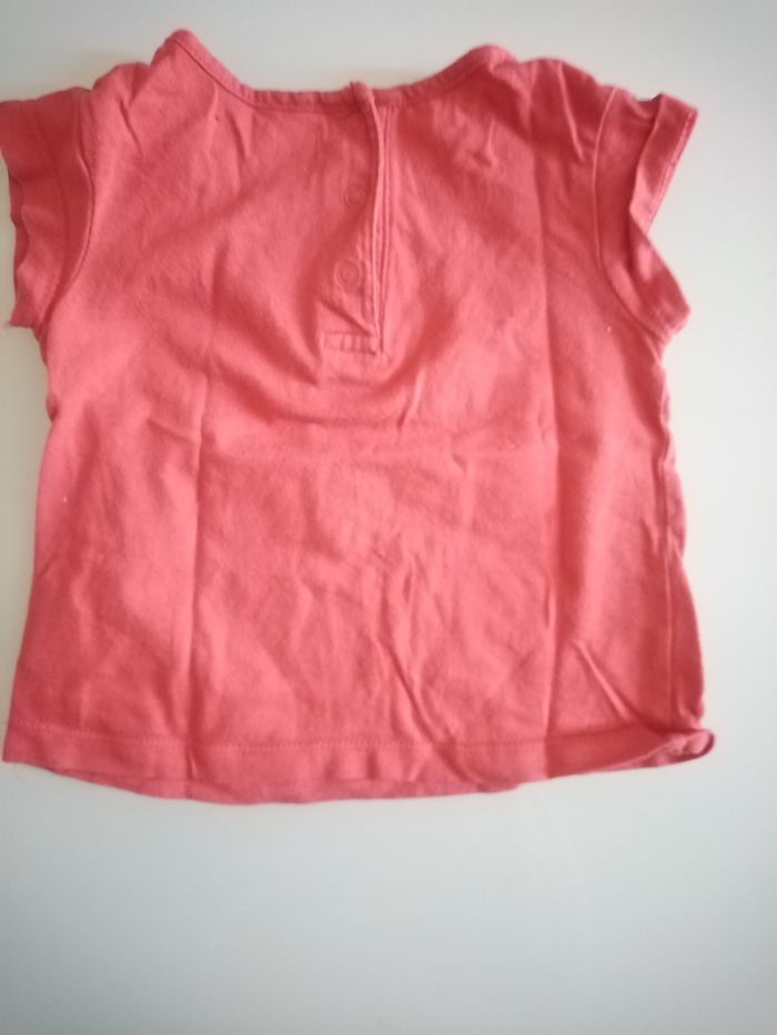 2 tee-shirts manches courtes 1 orangé, marque DPAM, boutons pressions au dos, très bon état 1 rose clair, marque KIMBALOO, boutons pressions au dos (petite tâche vers le col DEVANT. Sinon, très bon état) Taille 3-6 mois