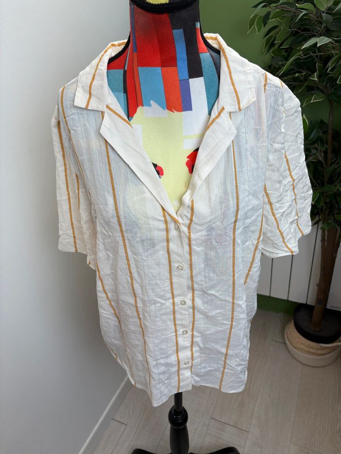 🎁 SOLDES 🎁 💸 -10% dès deux articles achetés! 💸 ✅: Très bon état 🎨 : Blanc et jaune moutarde 🧵: 70% viscose, 28% polyester, 2% autres ​📏​: L / 40 / 12 Réf.: P13072025 #chemise #etam #large