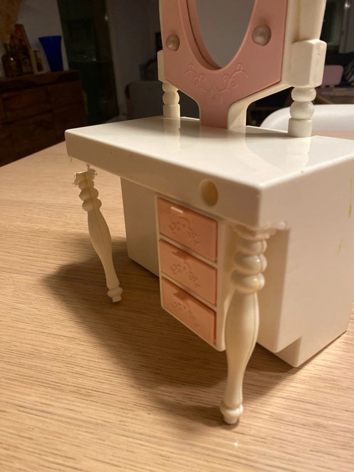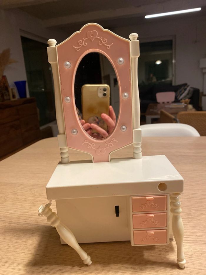 #vintage #barbie #mattel Coiffeuse : les 2 pieds sont cassés et ont été recollés mais cela n’a pas tenu . Trace de crayon sur un côté Piles non fournies Lumières autour du miroir et bruit sèche cheveux